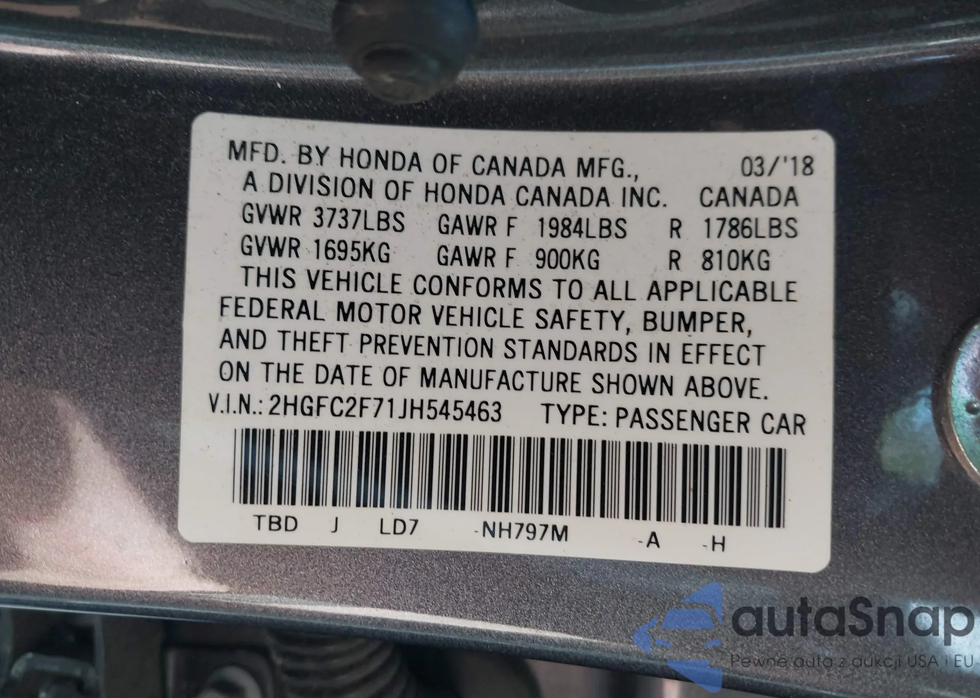 LOT: 40492631 VIN: 2HGFC2F71JH545463