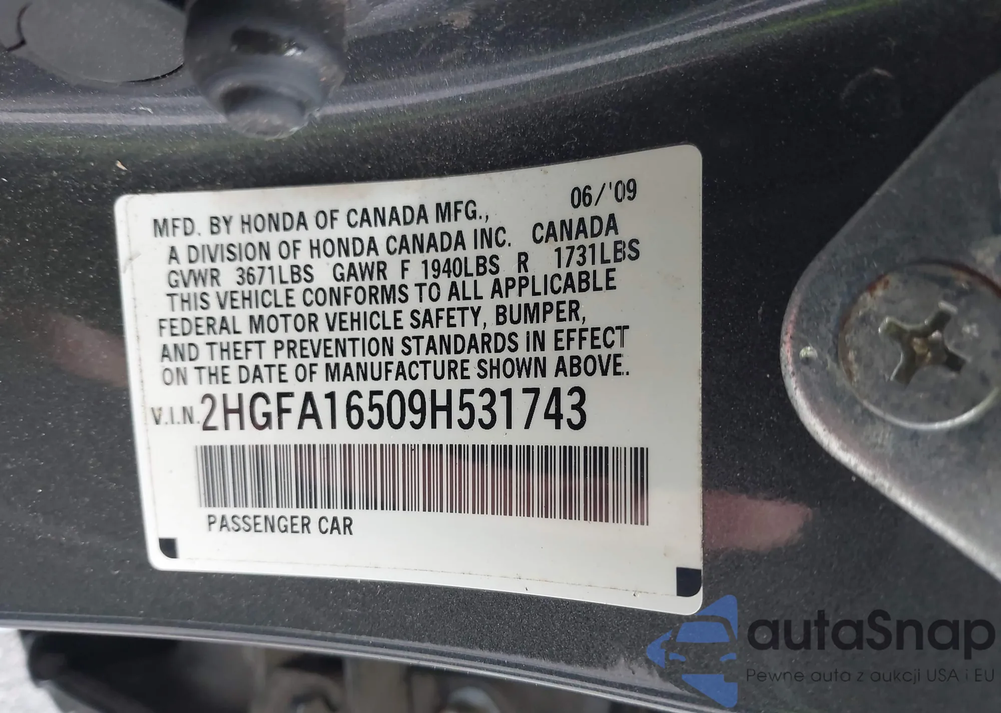 • VIN 2HGFA16509H531743