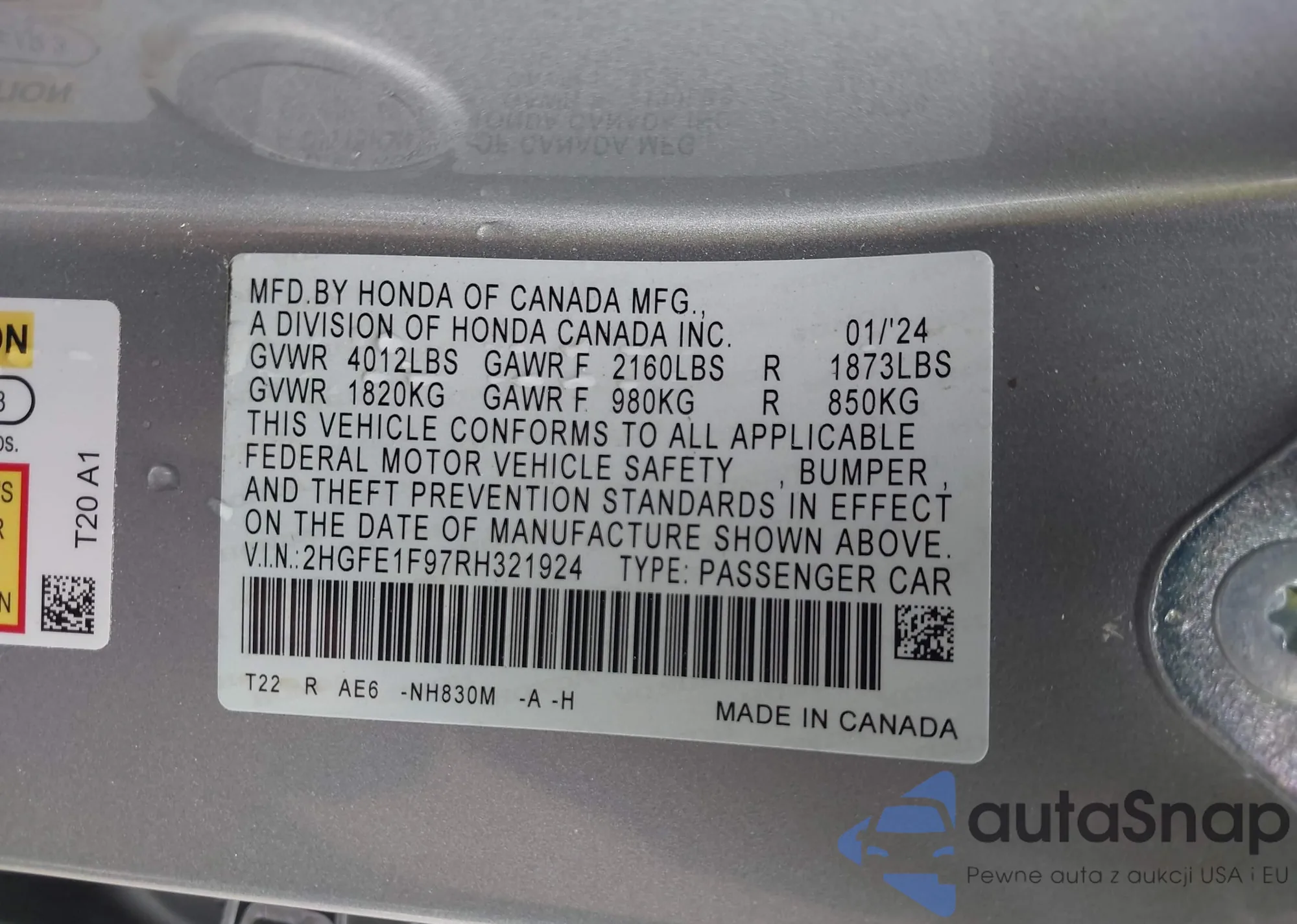 LOT: 40760487 VIN: 2HGFE1F97RH321924