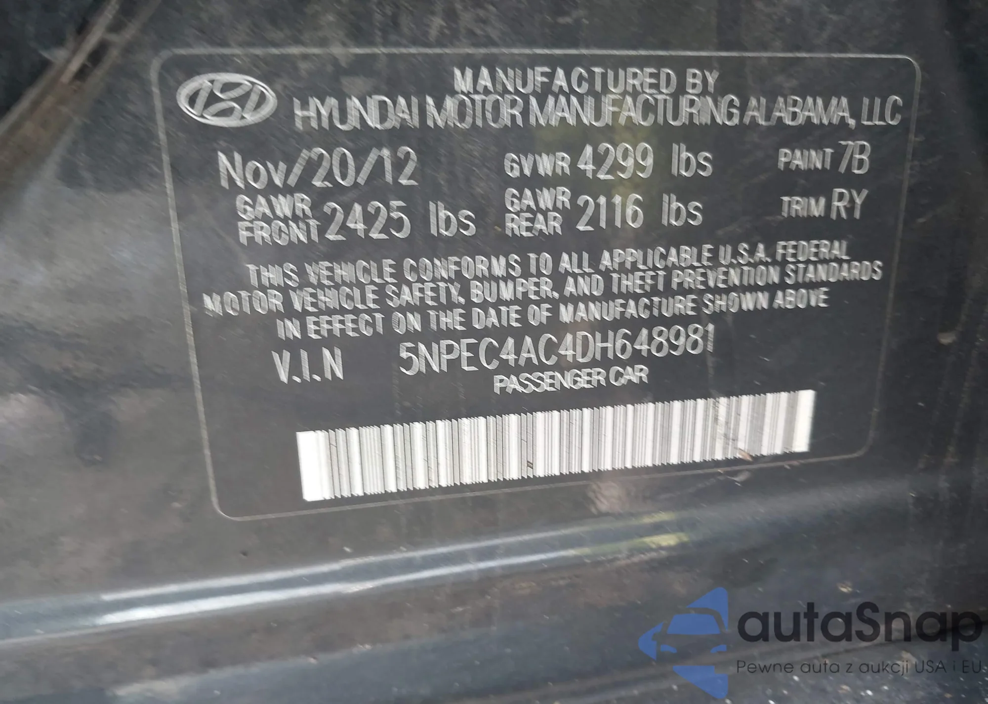 LOT: 40942475 VIN: 5NPEC4AC4DH648981