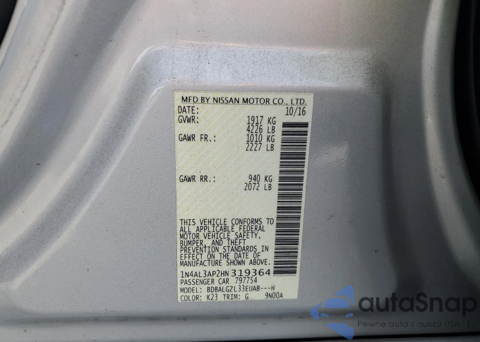 LOT: 85913094 VIN: 1N4AL3AP2HN319364