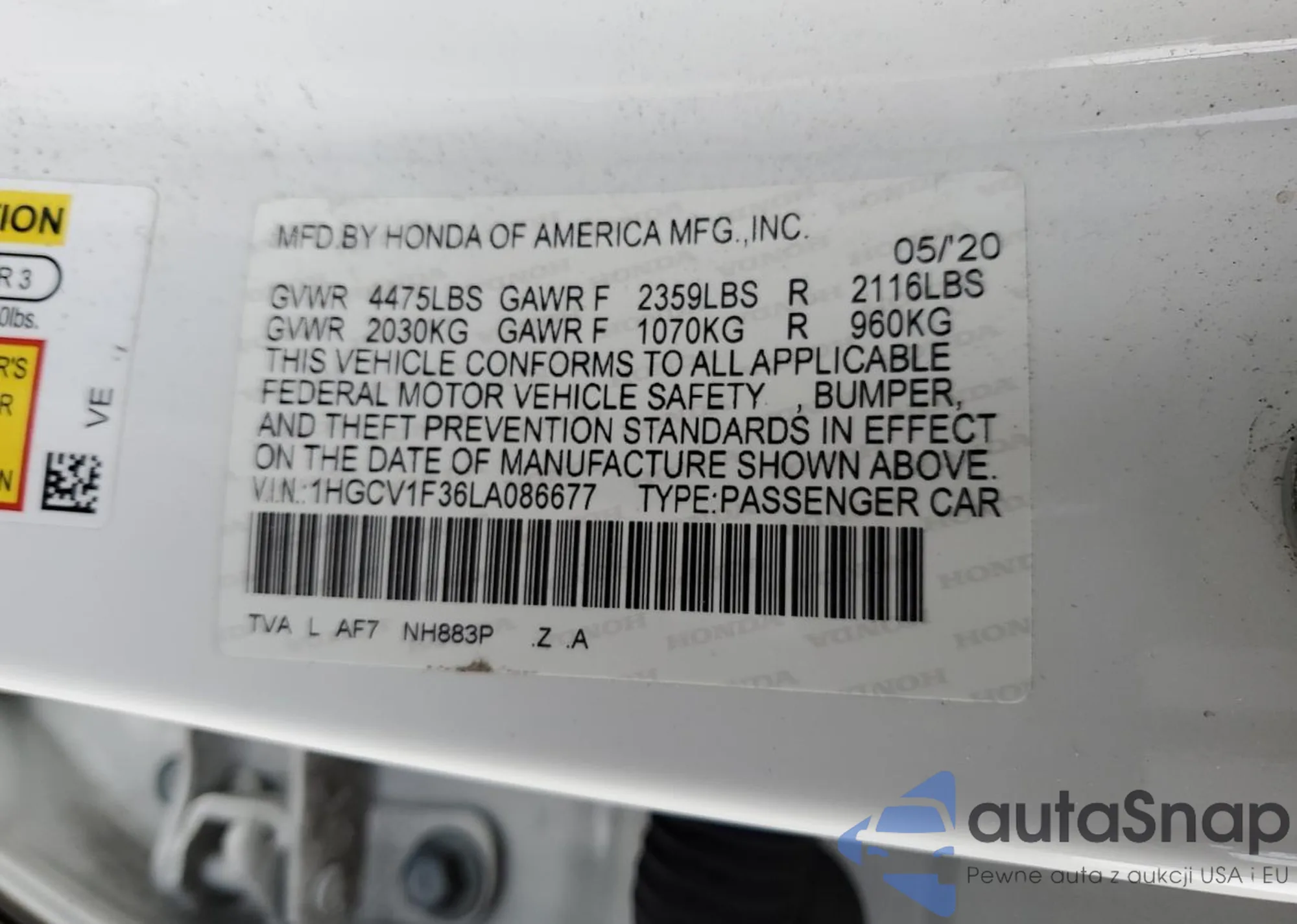 • VIN 1HGCV1F36LA086677