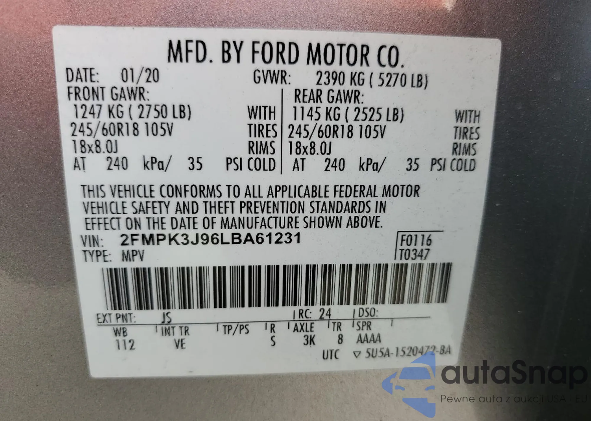 • VIN 2FMPK3J96LBA61231