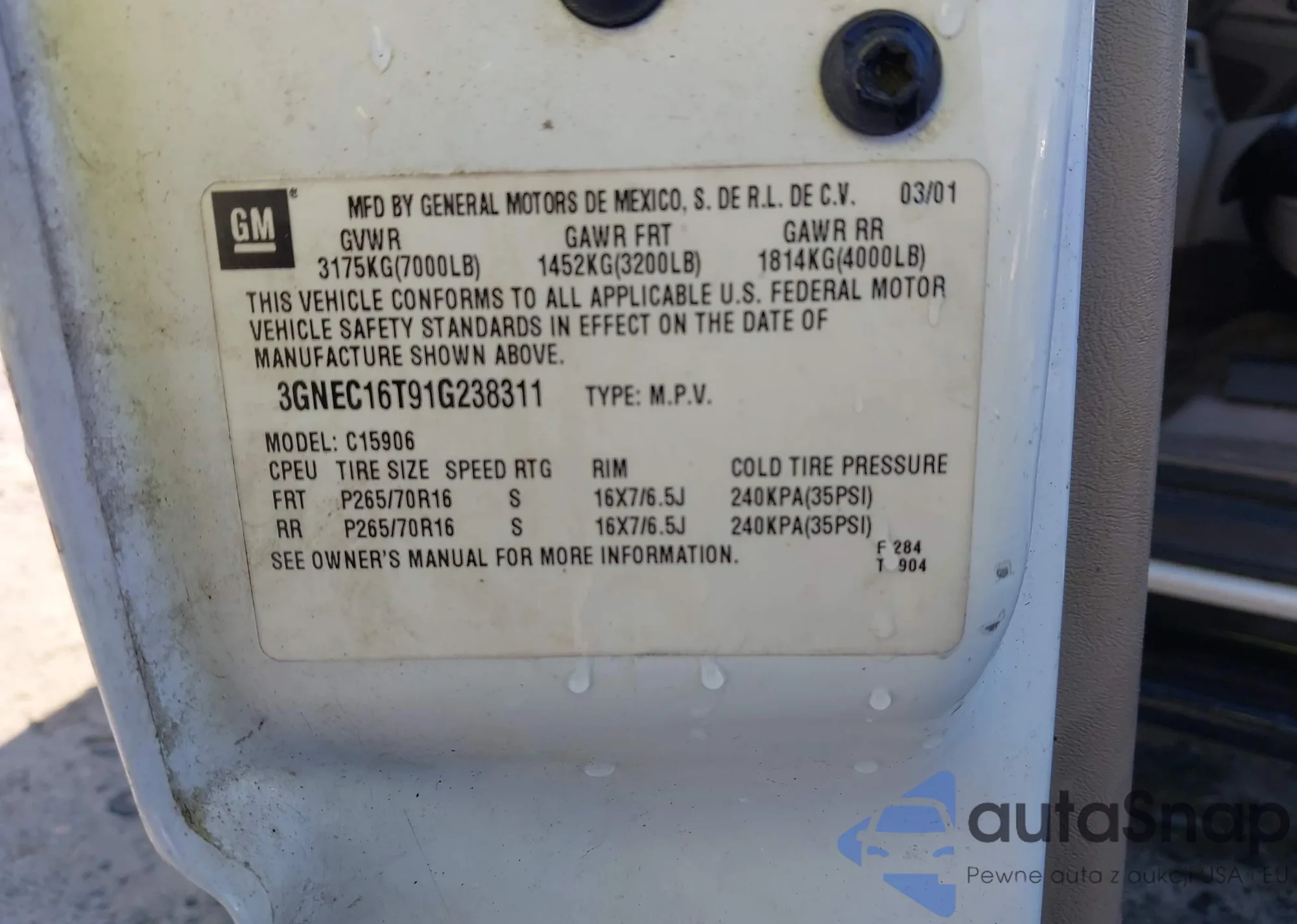 • VIN 3GNEC16T91G238311