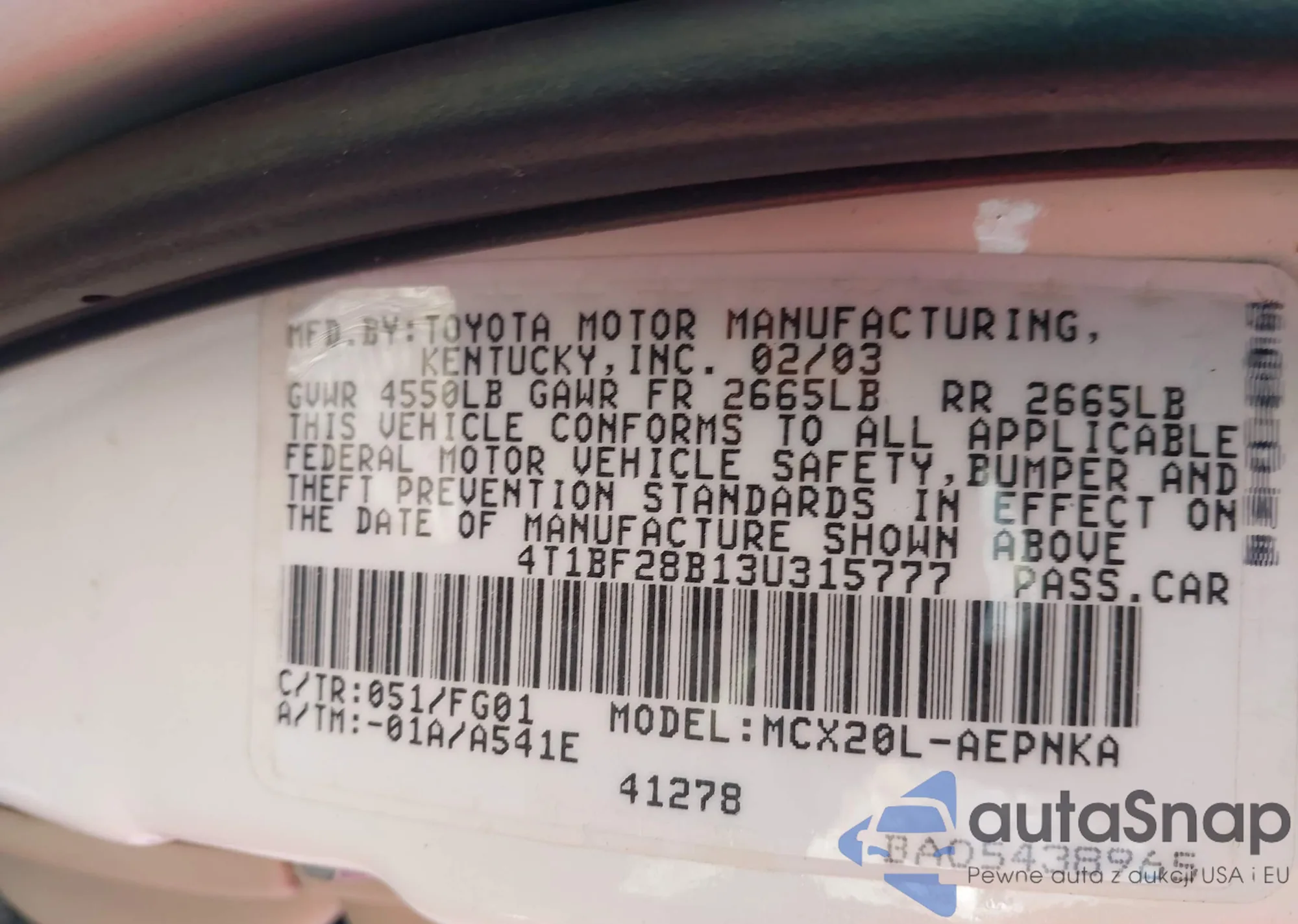 • VIN 4T1BF28B13U315777