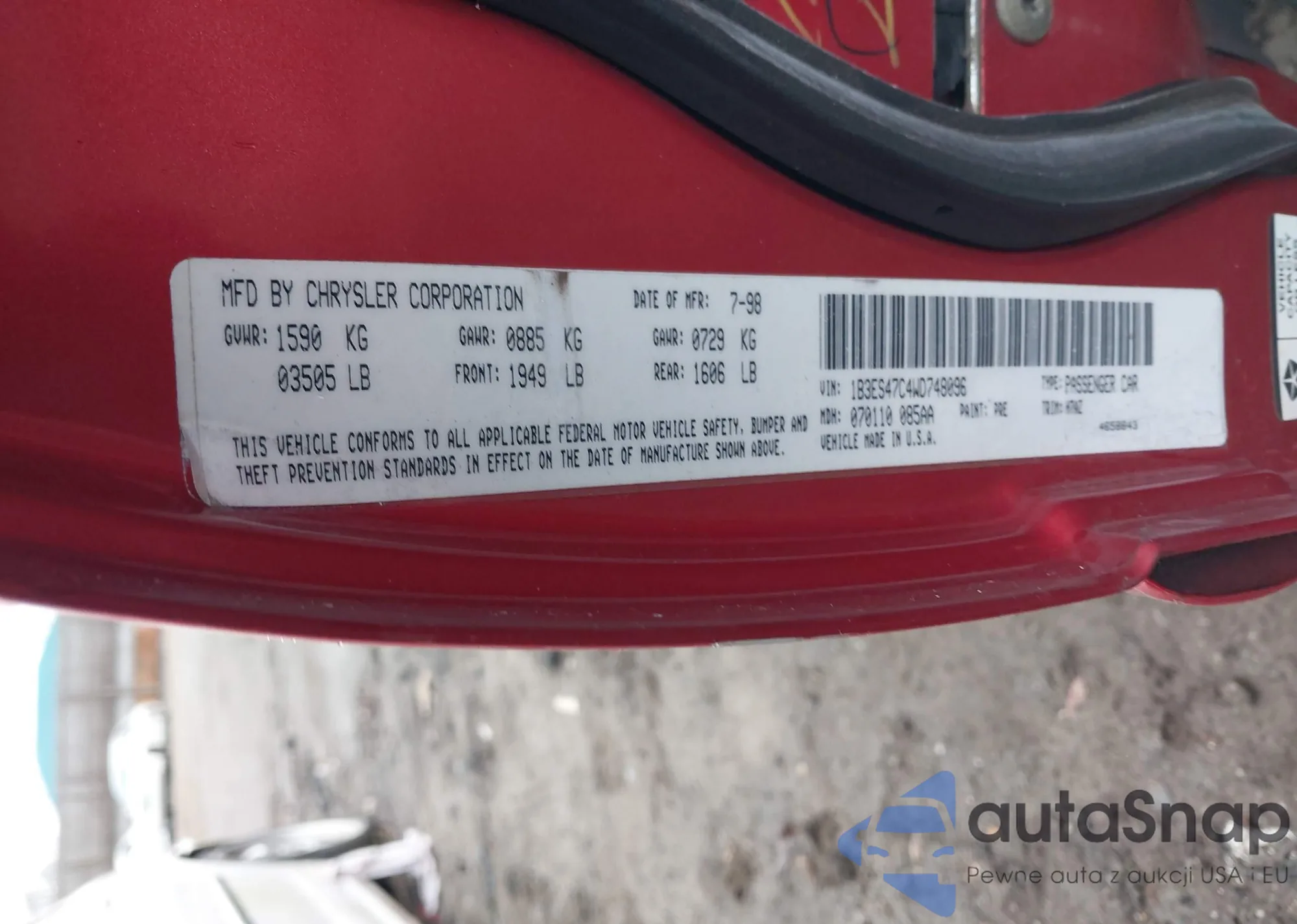 1998 Dodge Neon Competition/Highline z USA, uszkodzony, nr VIN 1B3ES47C4WD748096