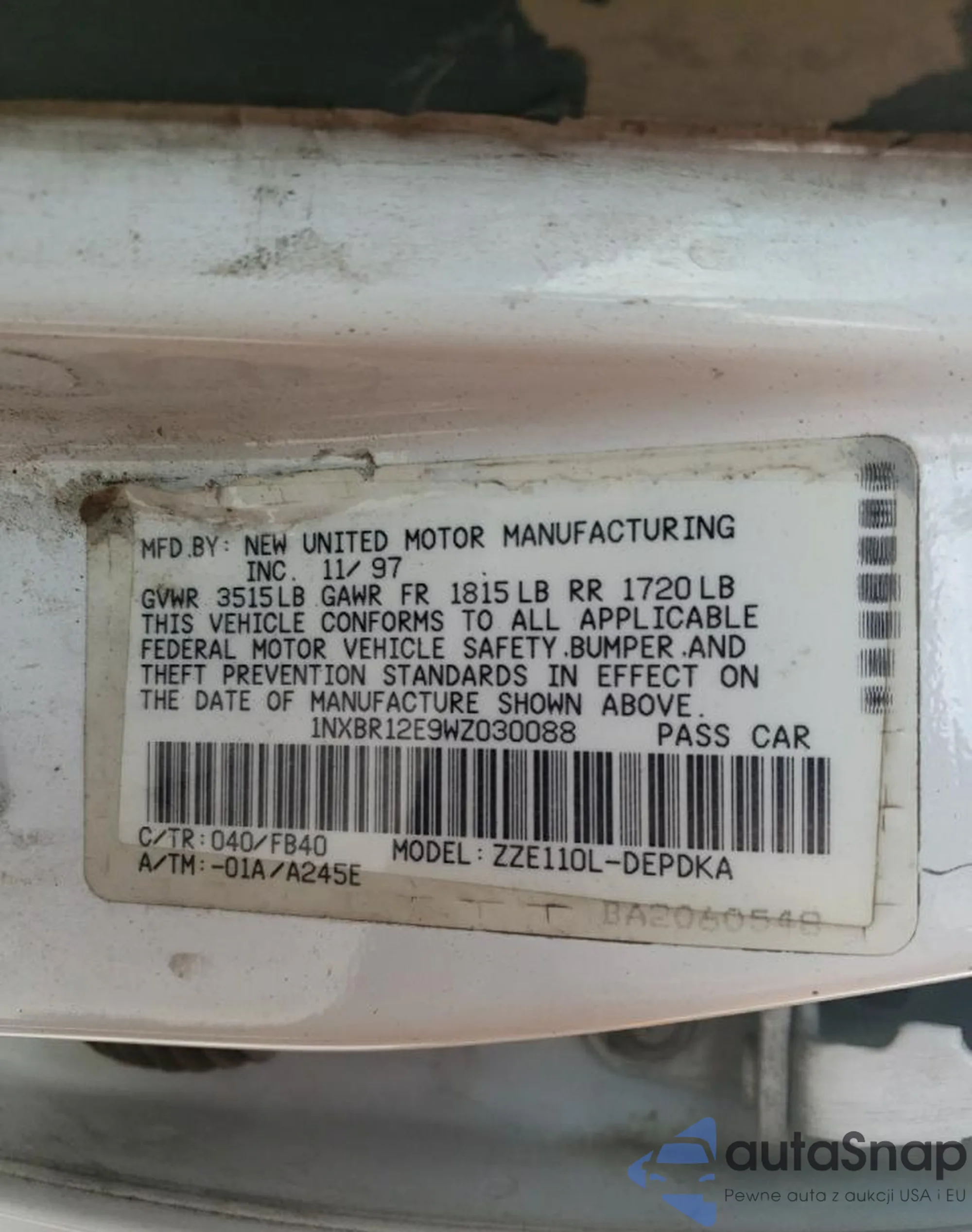 LOT: 70291332 VIN: 1NXBR12E9WZ030088