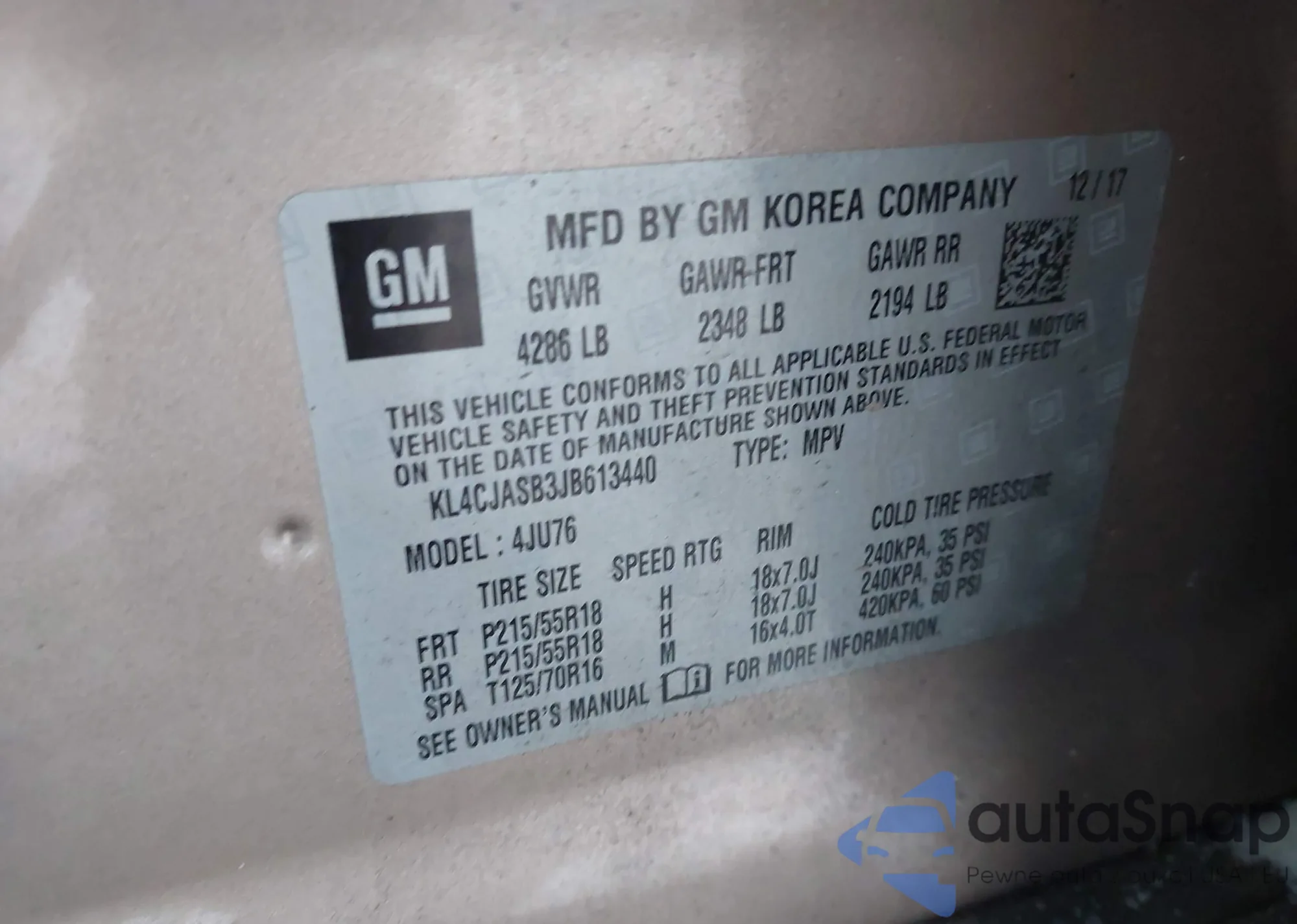 • VIN KL4CJASB3JB613440