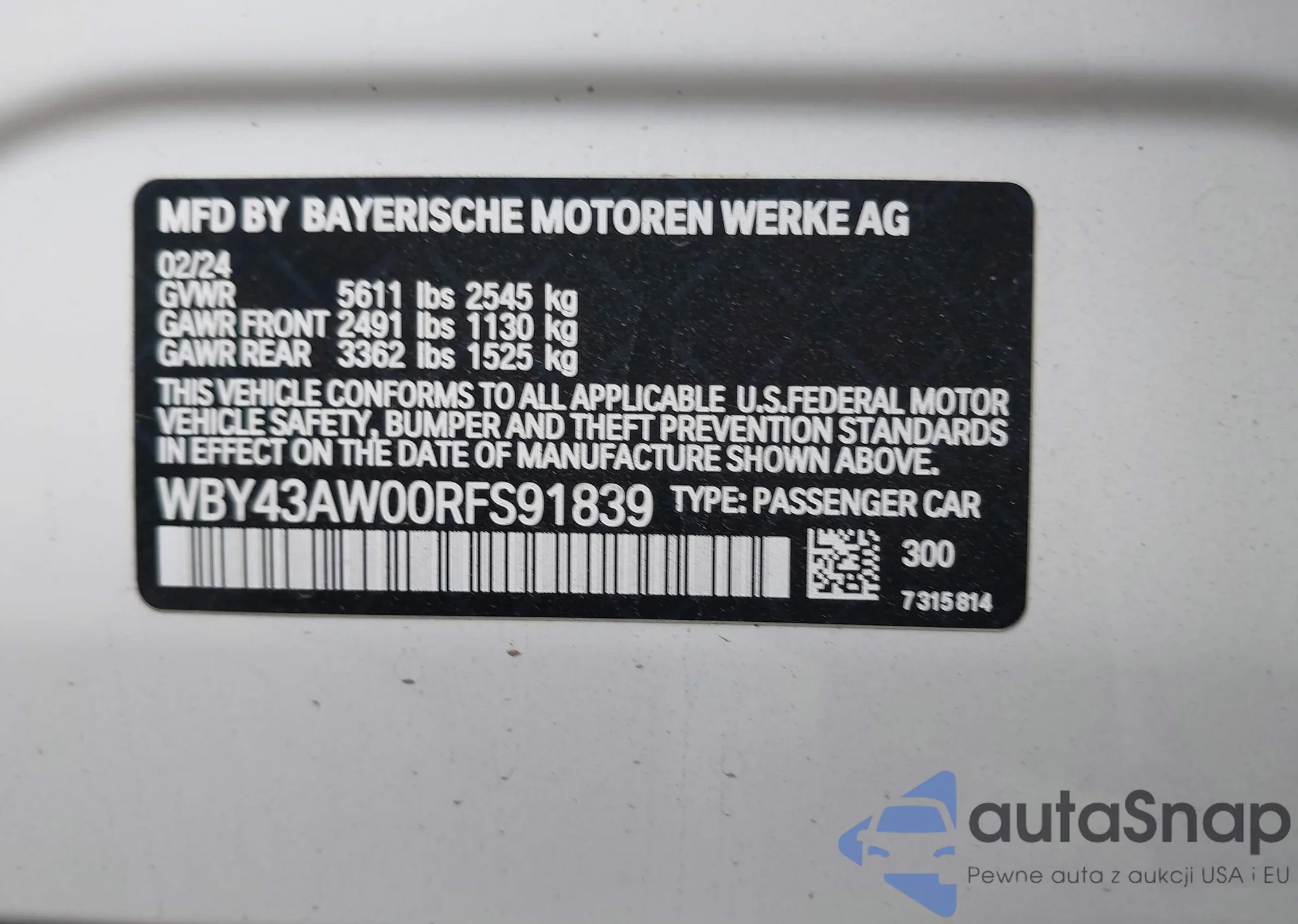 LOT: 40942884 VIN: WBY43AW00RFS91839