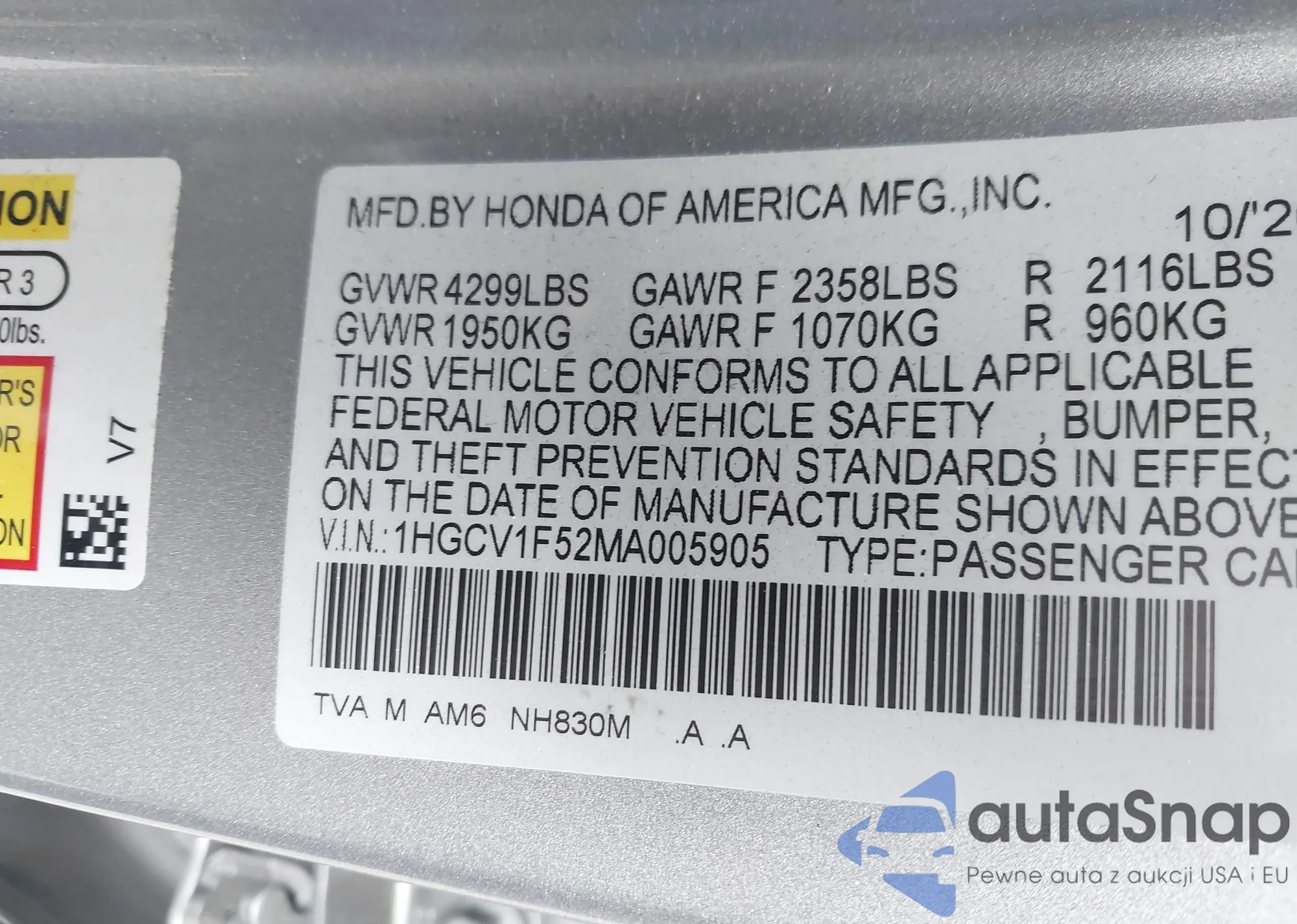 LOT: 41514910 VIN: 1HGCV1F52MA005905