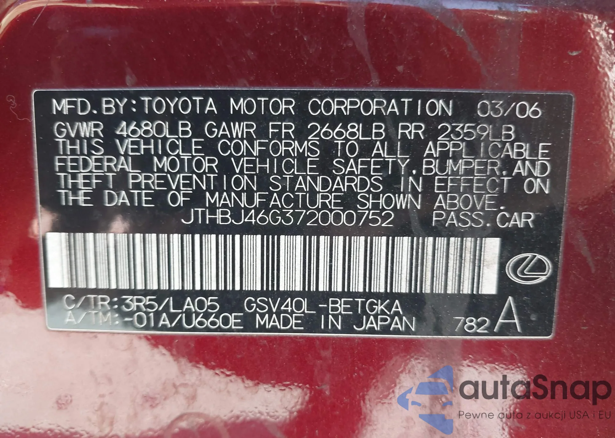 LOT: 41647192 VIN: JTHBJ46G372000752