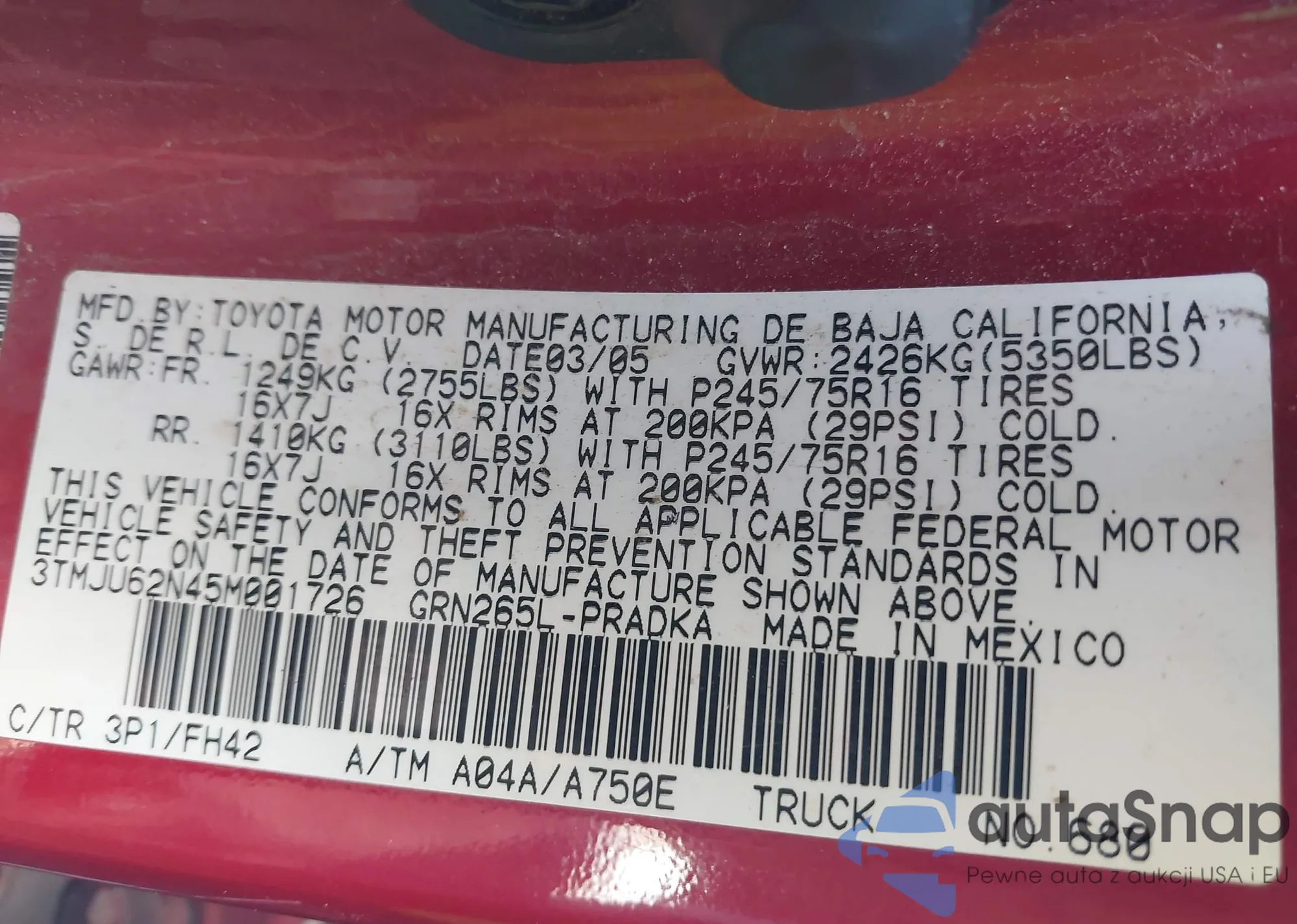 • VIN 3TMJU62N45M001726