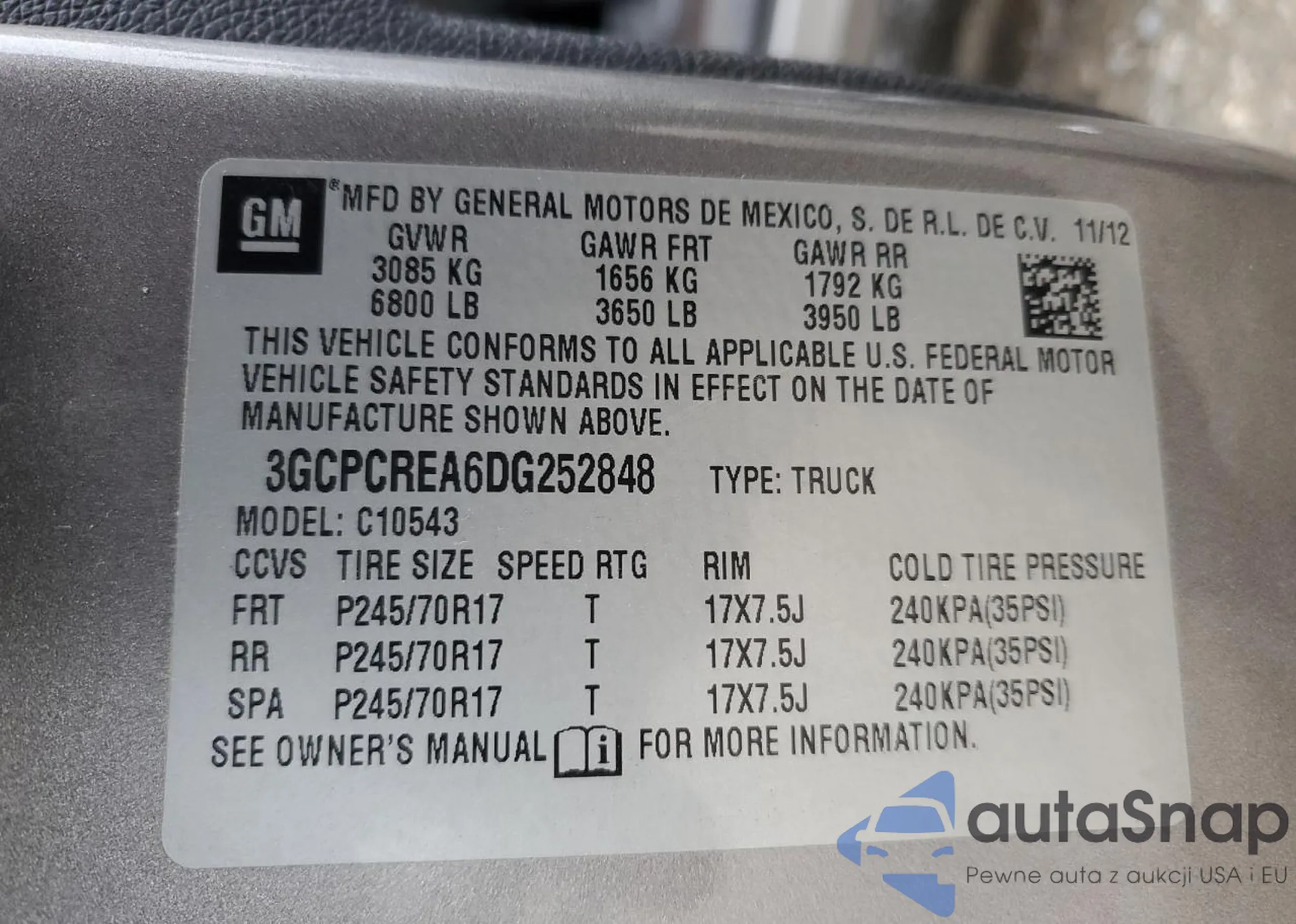 • VIN 3GCPCREA6DG252848