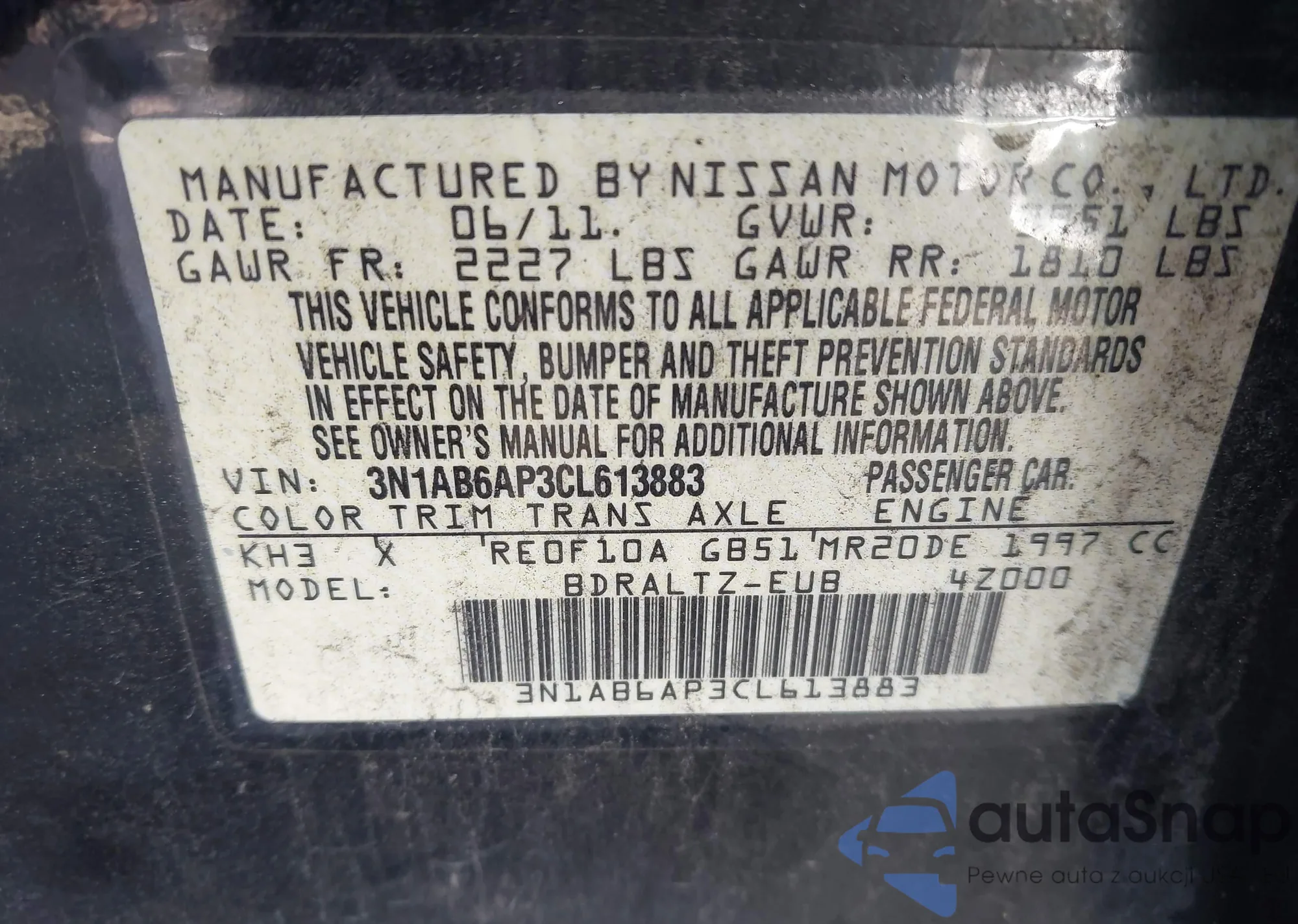 LOT: 40910455 VIN: 3N1AB6AP3CL613883