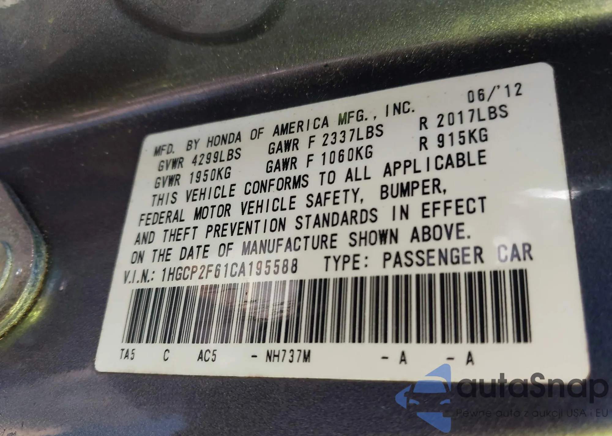 • VIN 1HGCP2F61CA195588