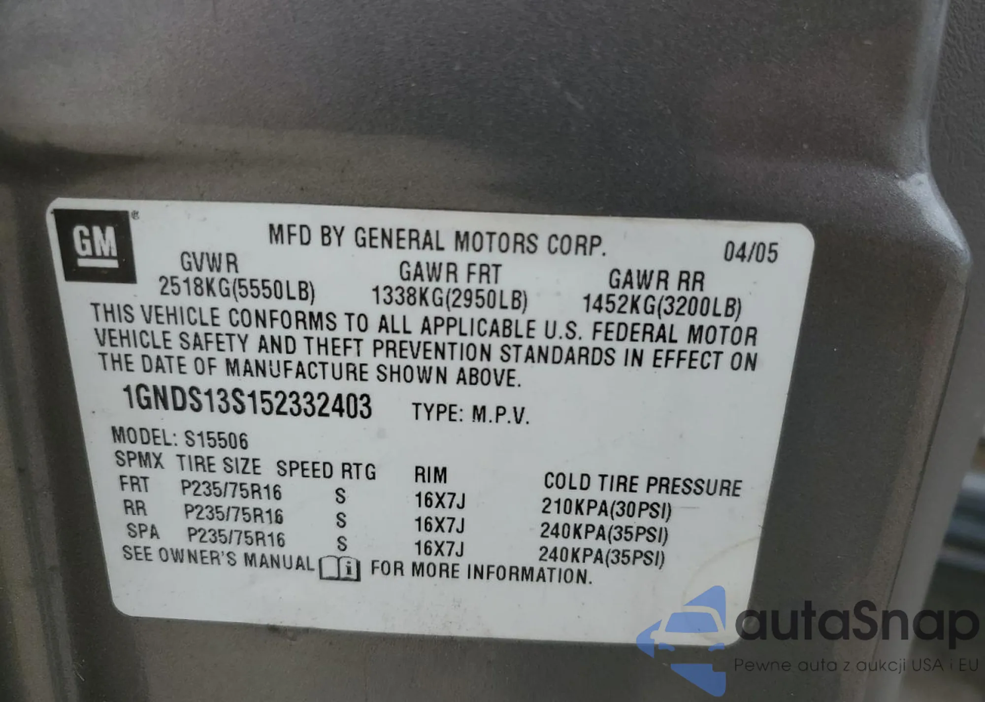 LOT: 70885874 VIN: 1GNDS13S152332403