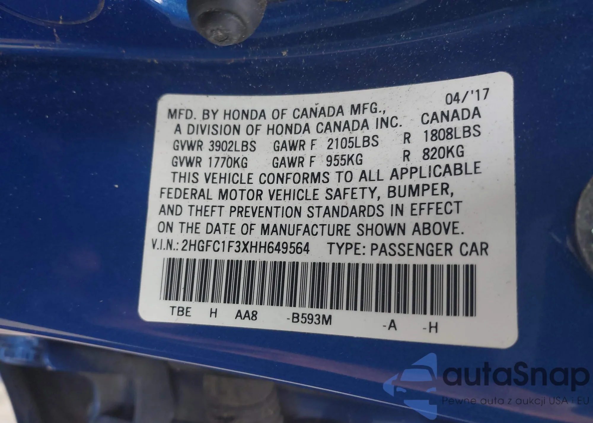 LOT: 40817834 VIN: 2HGFC1F3XHH649564