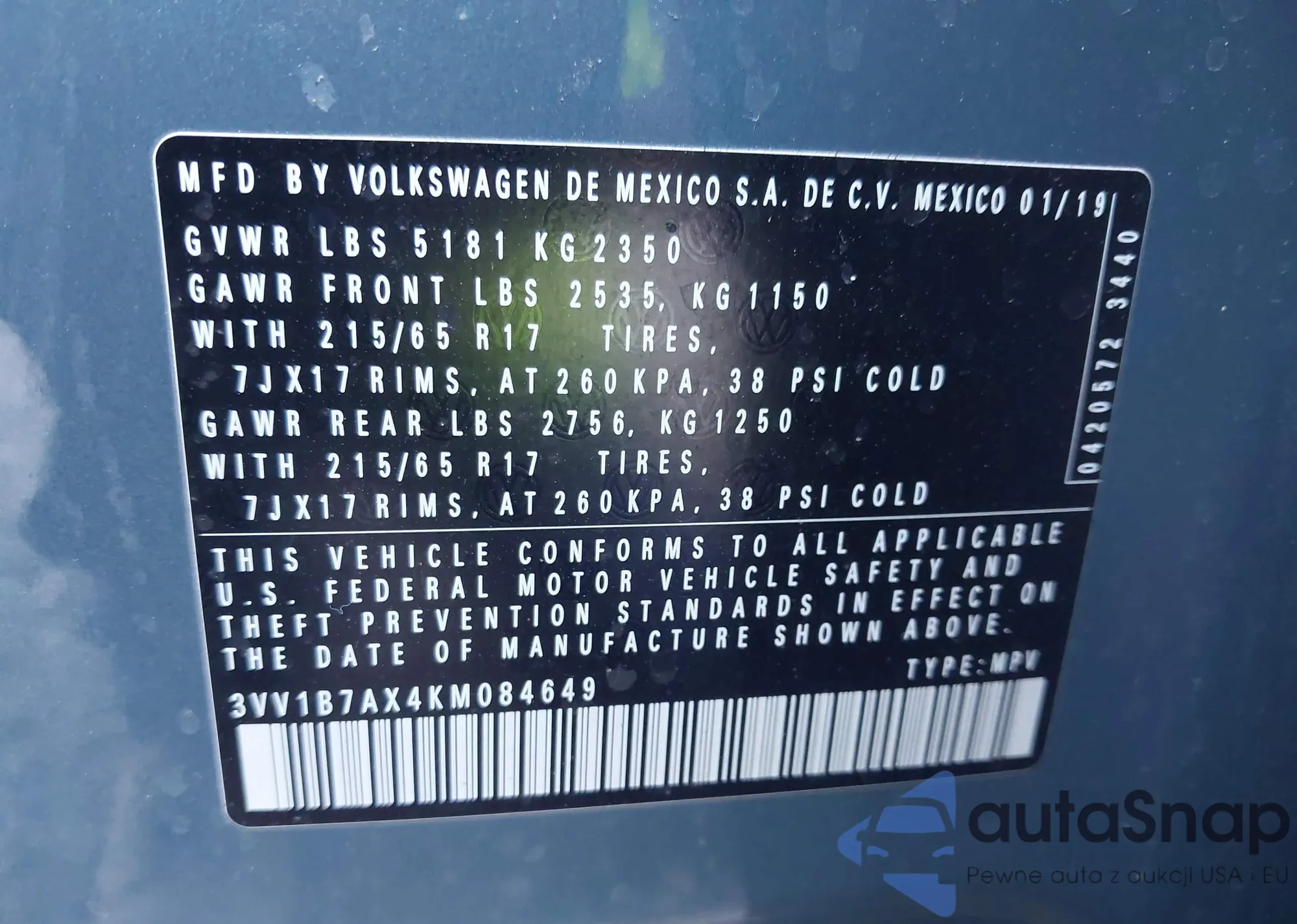 LOT: 40673264 VIN: 3VV1B7AX4KM084649