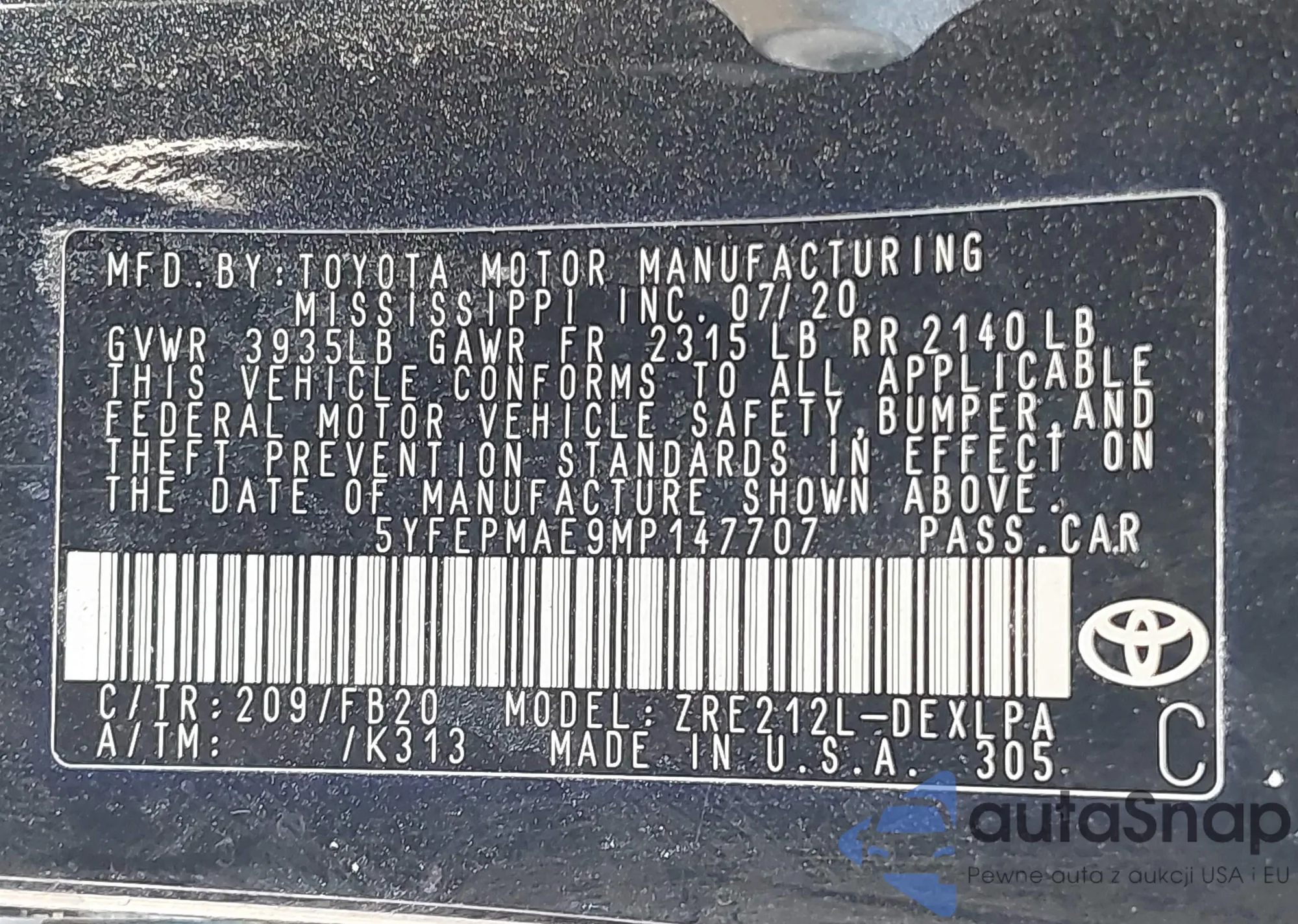 • VIN 5YFEPMAE9MP147707