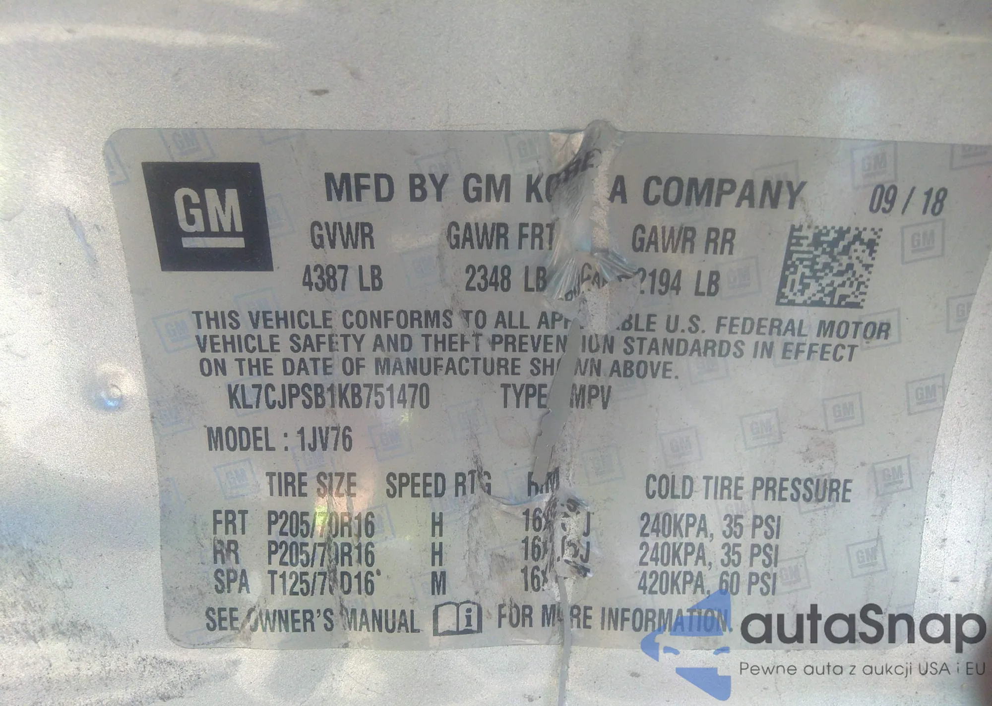 • VIN KL7CJPSB1KB751470