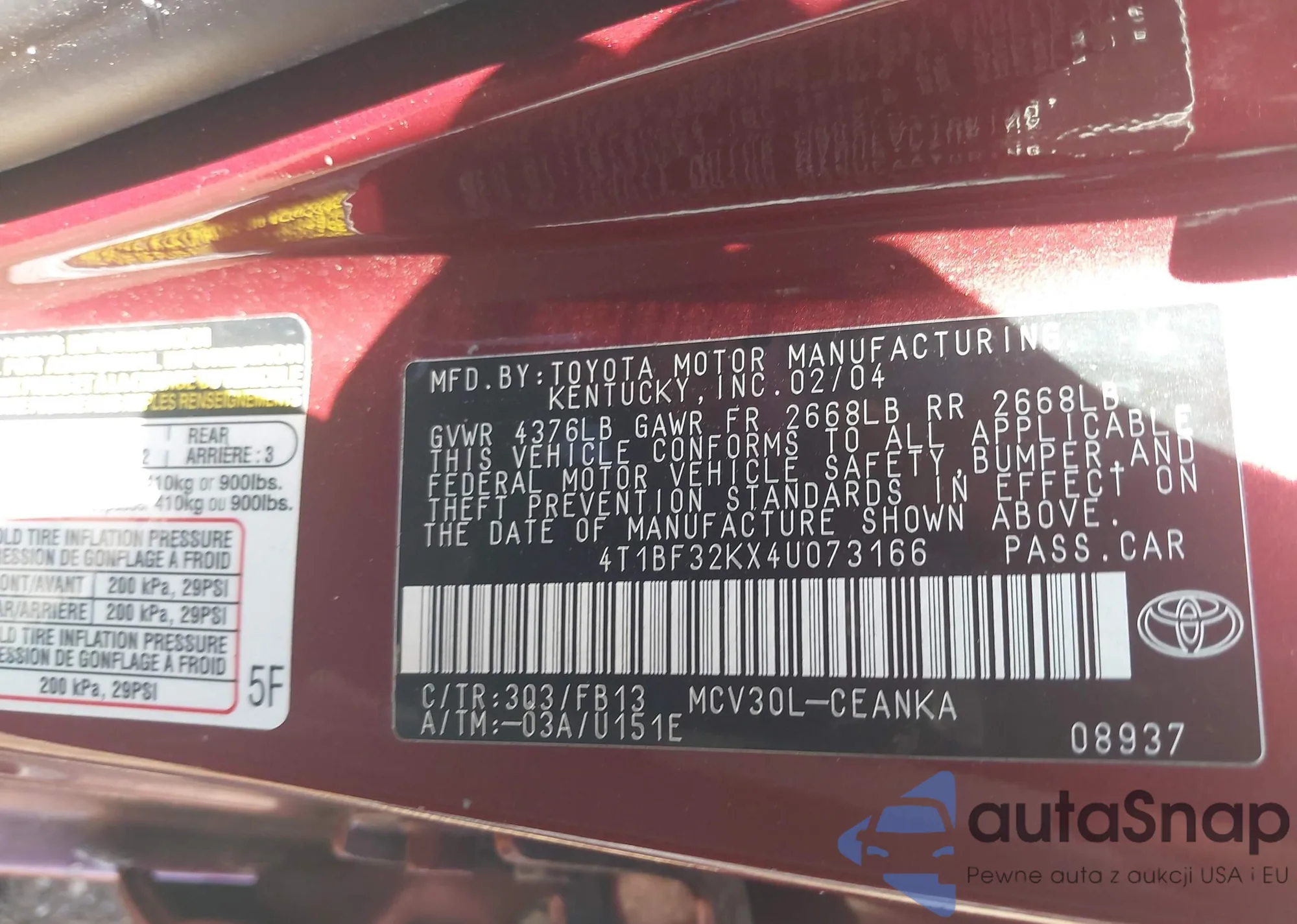 • VIN 4T1BF32KX4U073166