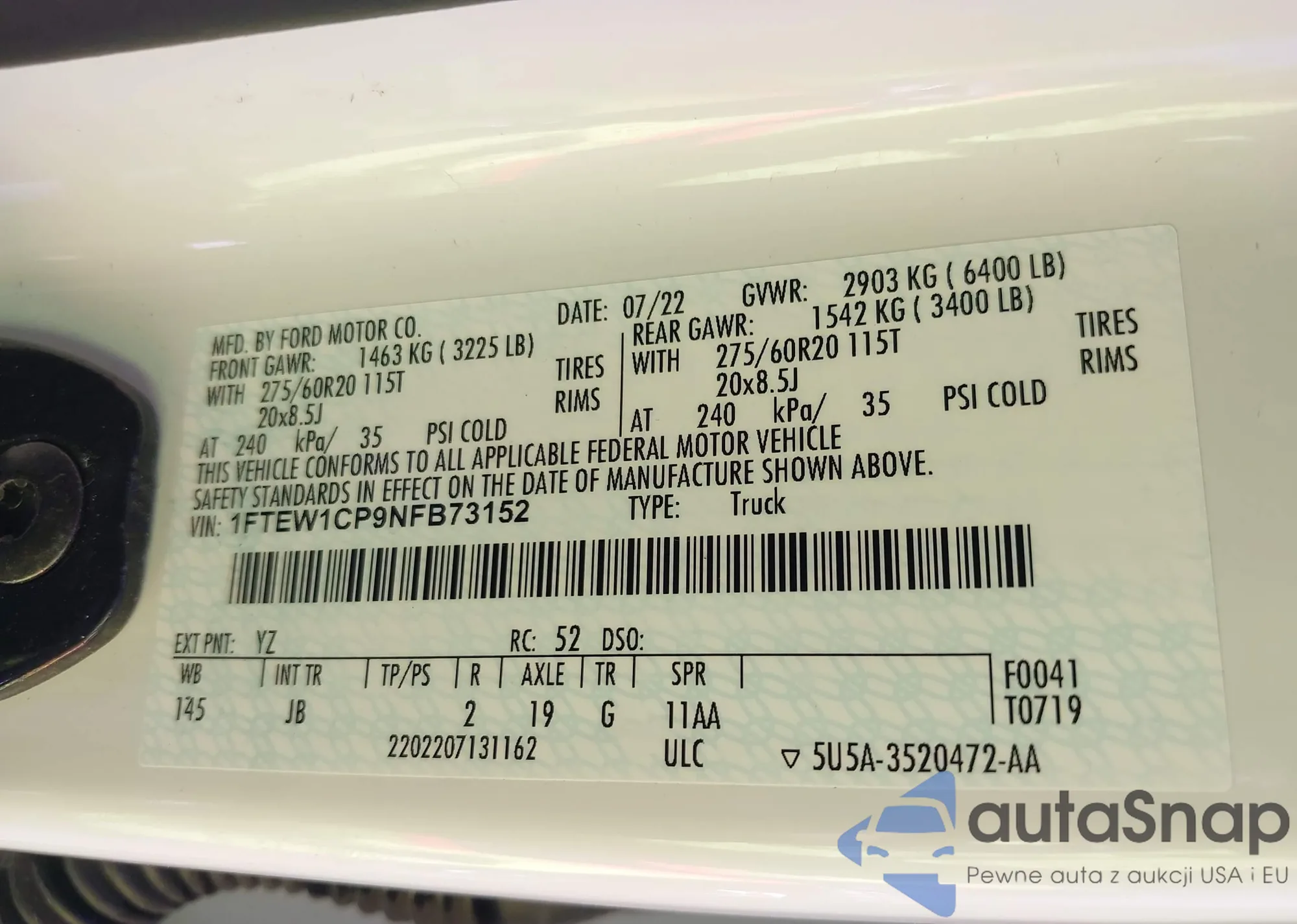 LOT: 41728112 VIN: 7SAXCBE63NF356730