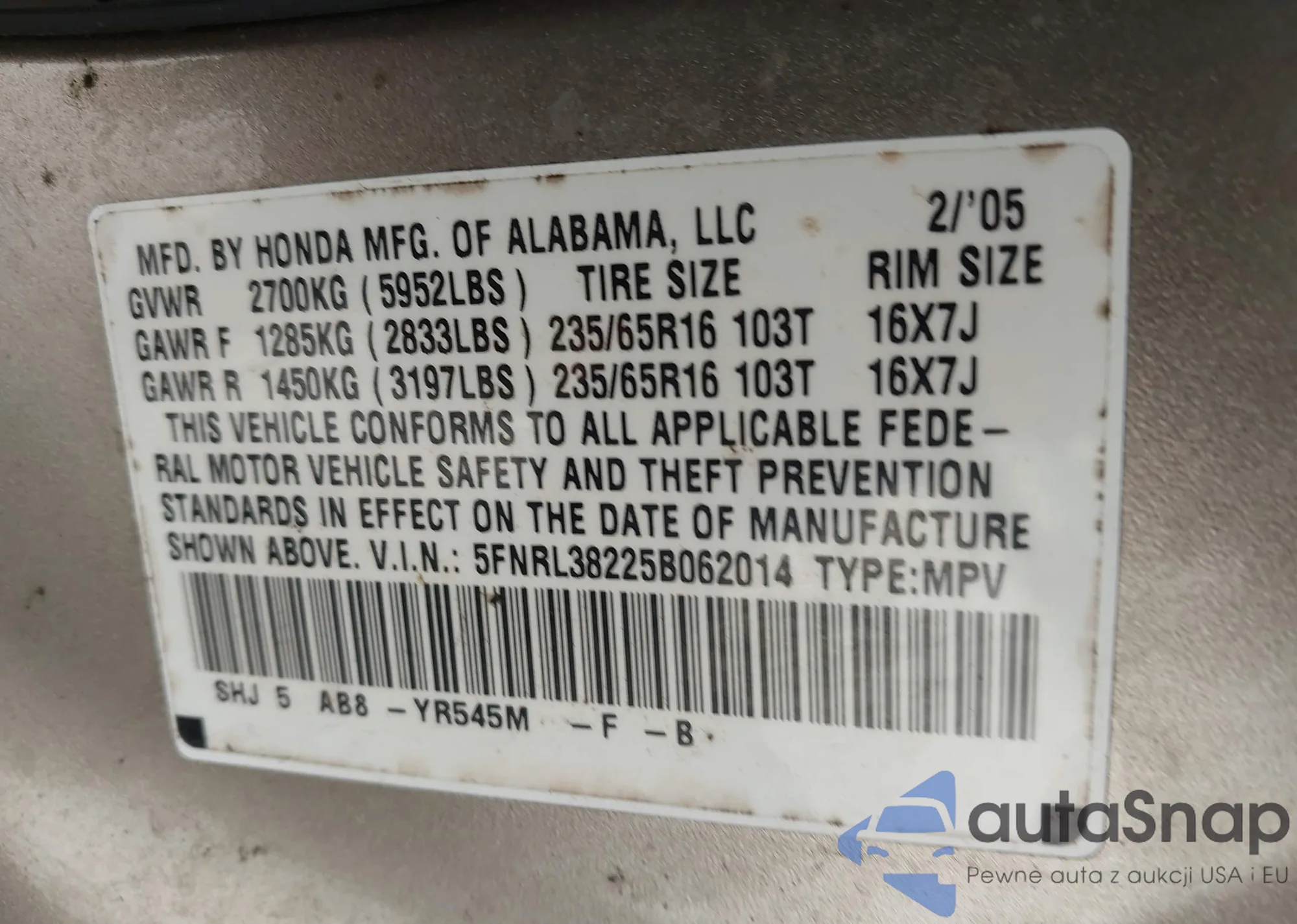 • VIN 5FNRL38225B062014
