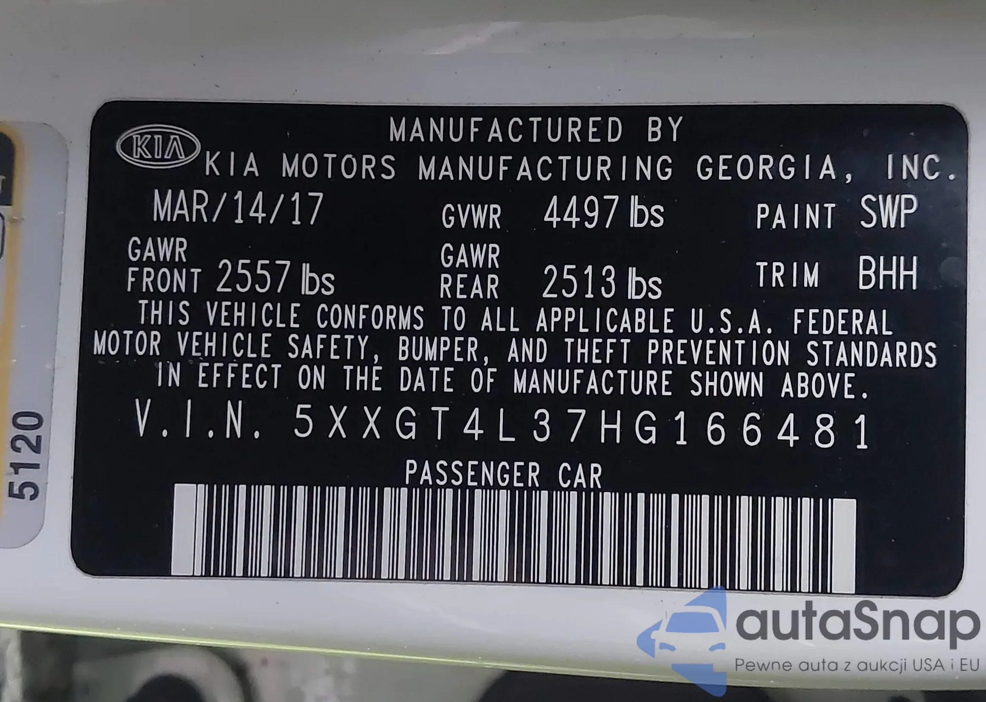 LOT: 41543685 VIN: 5XXGT4L37HG166481