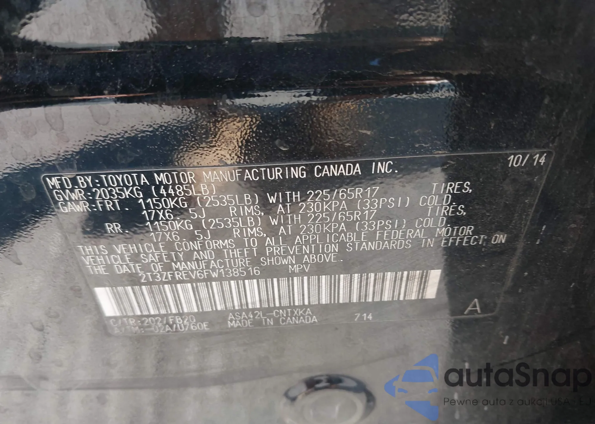 LOT: 41842431 VIN: 2T3ZFREV6FW138516