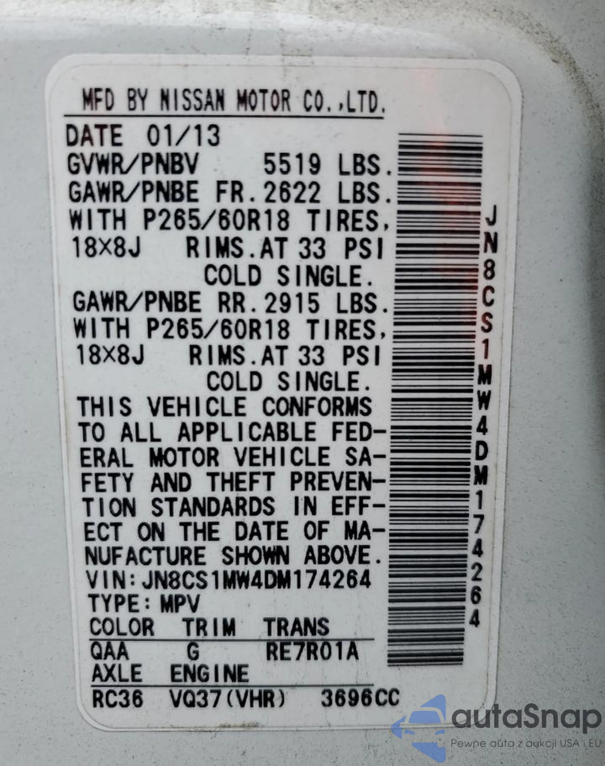 LOT: 43044575 VIN: JN8CS1MW4DM174264
