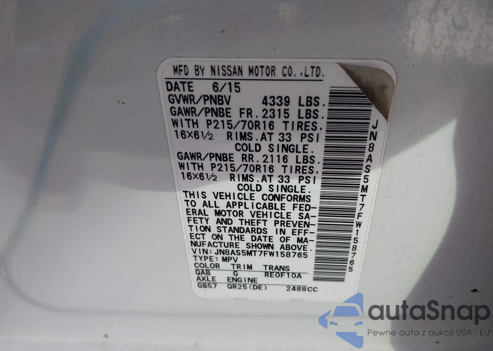 • VIN JN8AS5MT7FW158765