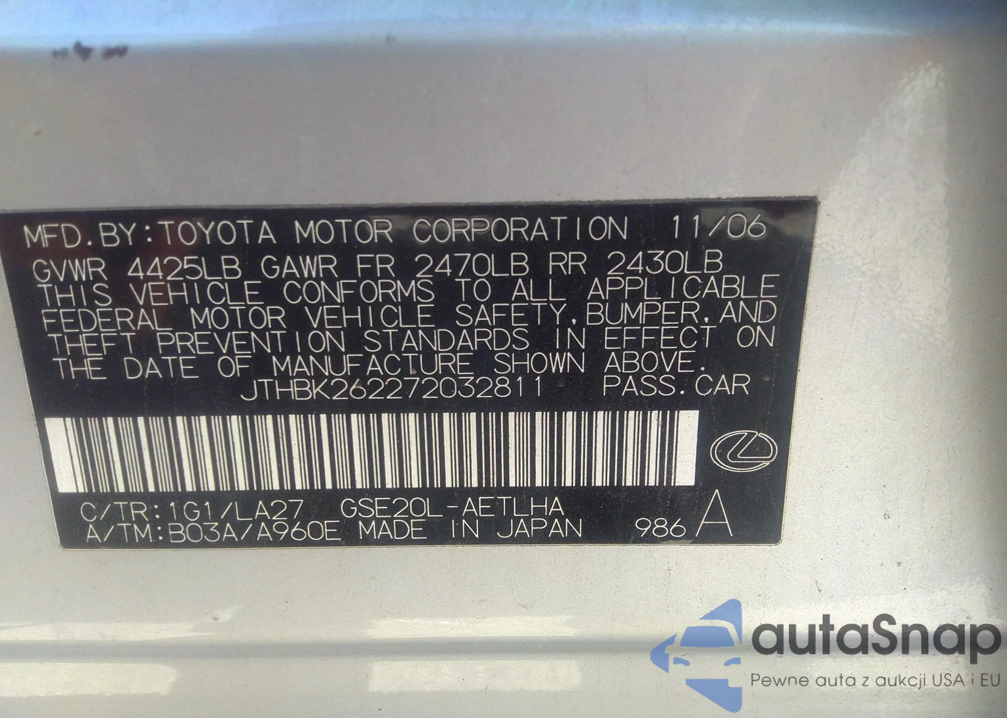 LOT: 35534442 VIN: JTHBK262272032811