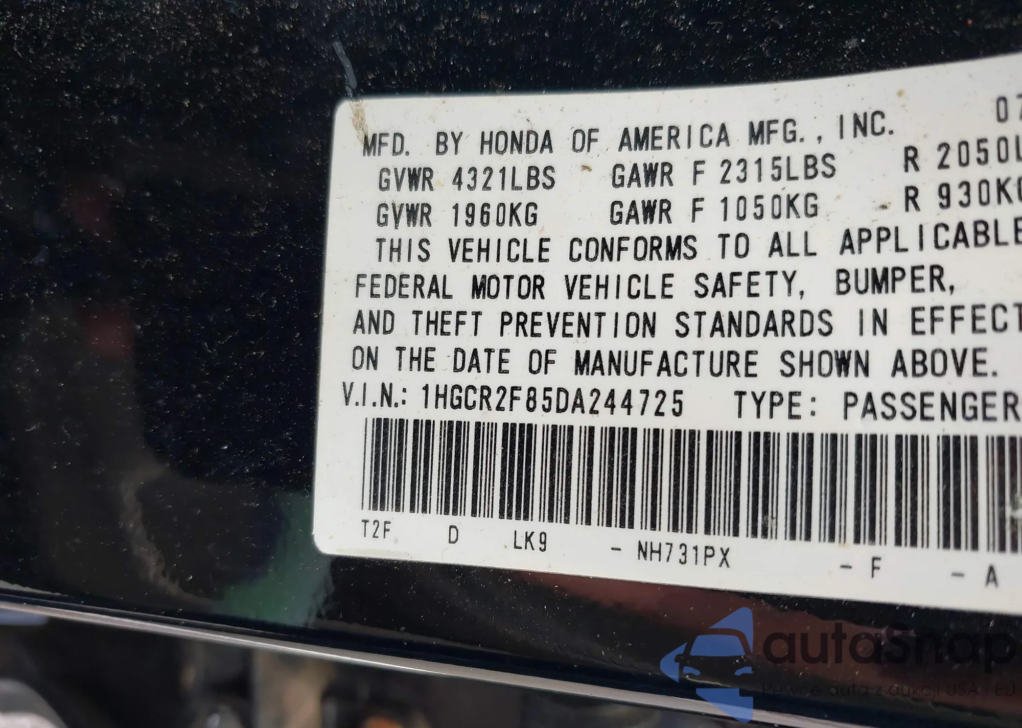 LOT: 39918810 VIN: 1HGCR2F85DA244725
