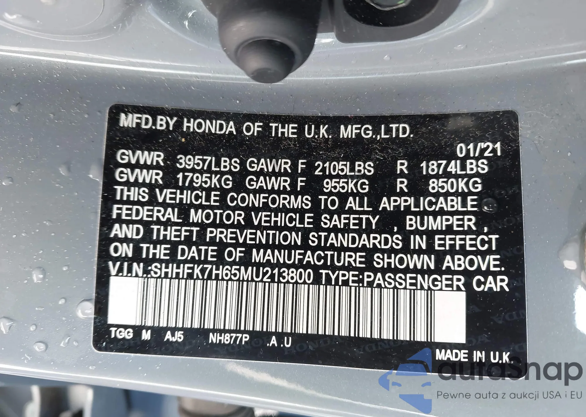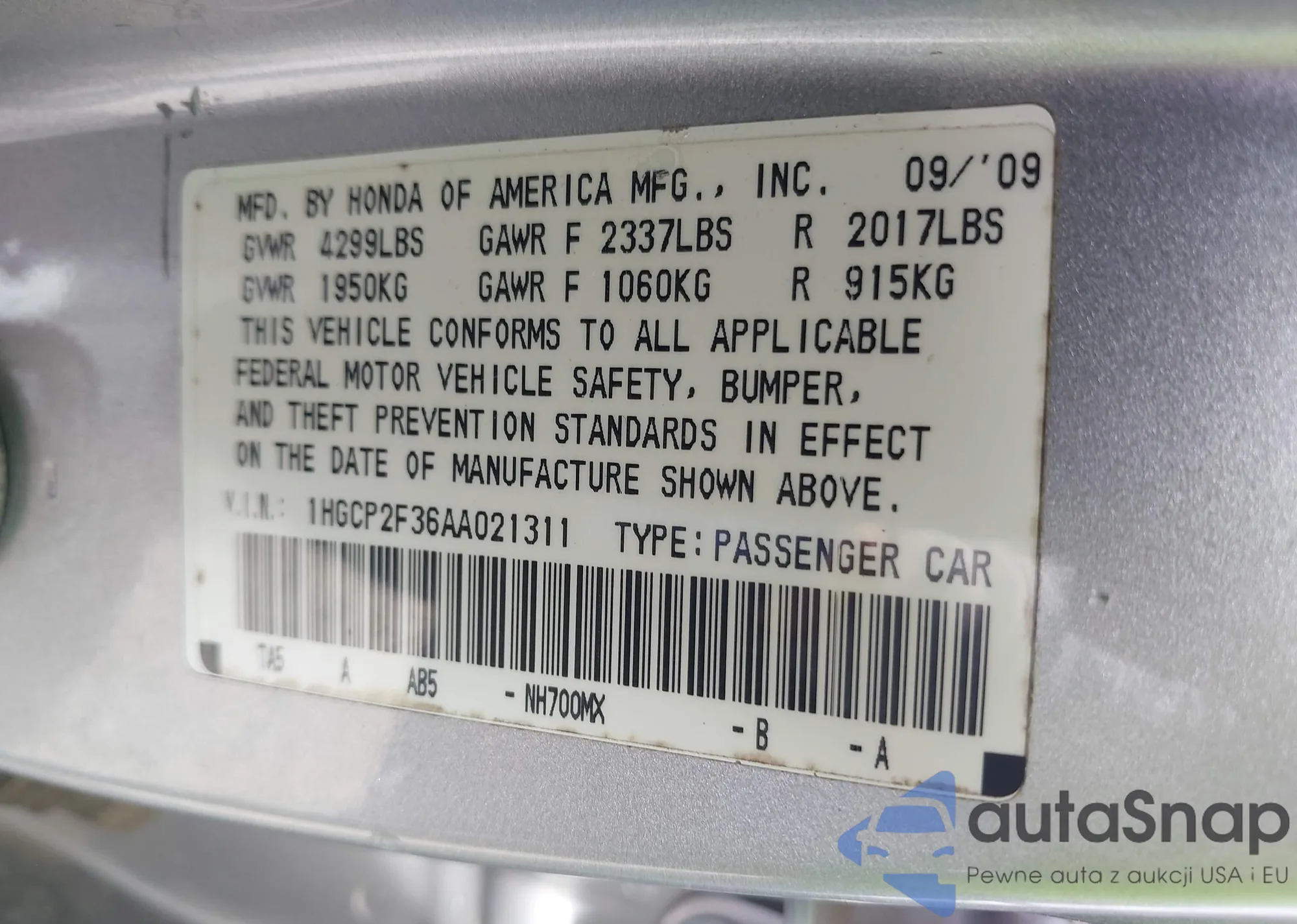 • VIN 1HGCP2F36AA021311