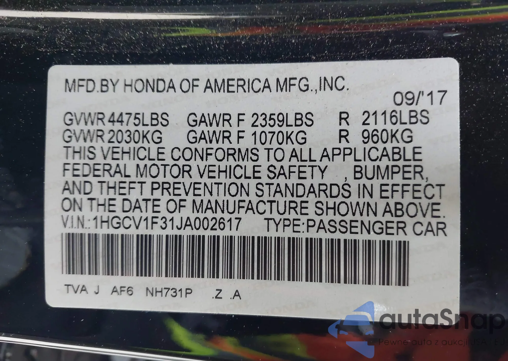 • VIN 1HGCV1F31JA002617