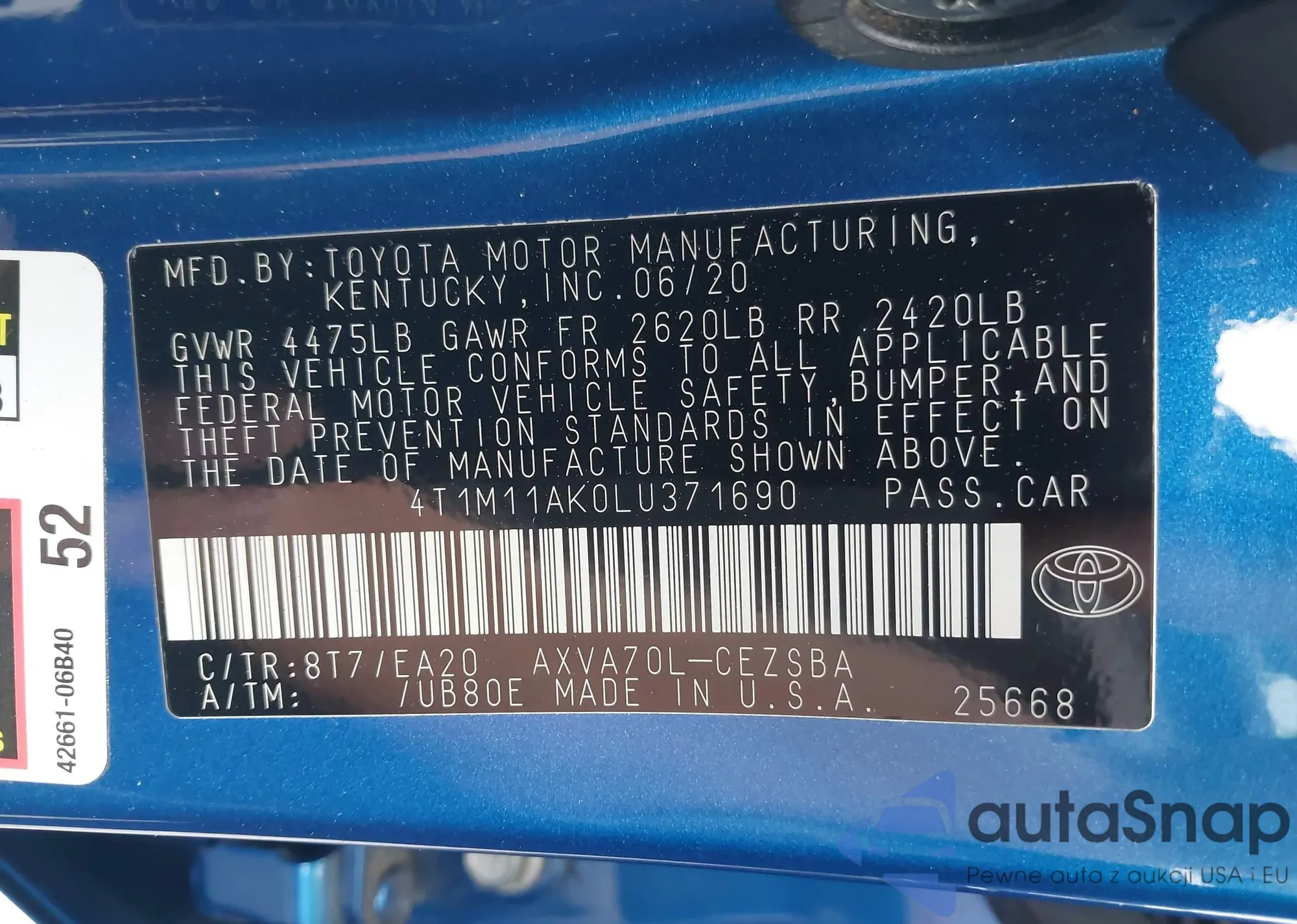 LOT: 41722768 VIN: 4T1M11AK0LU371690