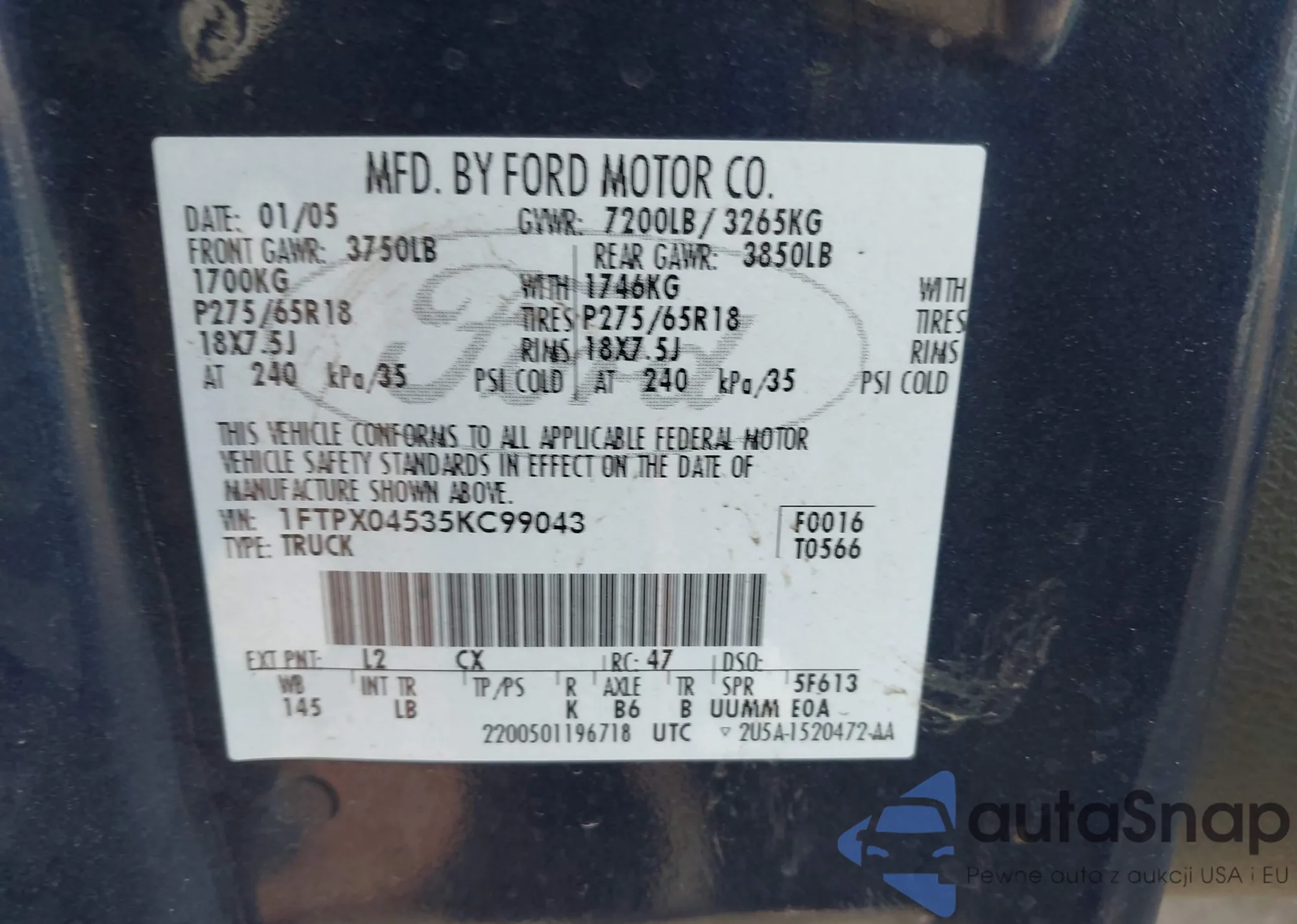 LOT: 41662466 VIN: 1FTPX04535KC99043