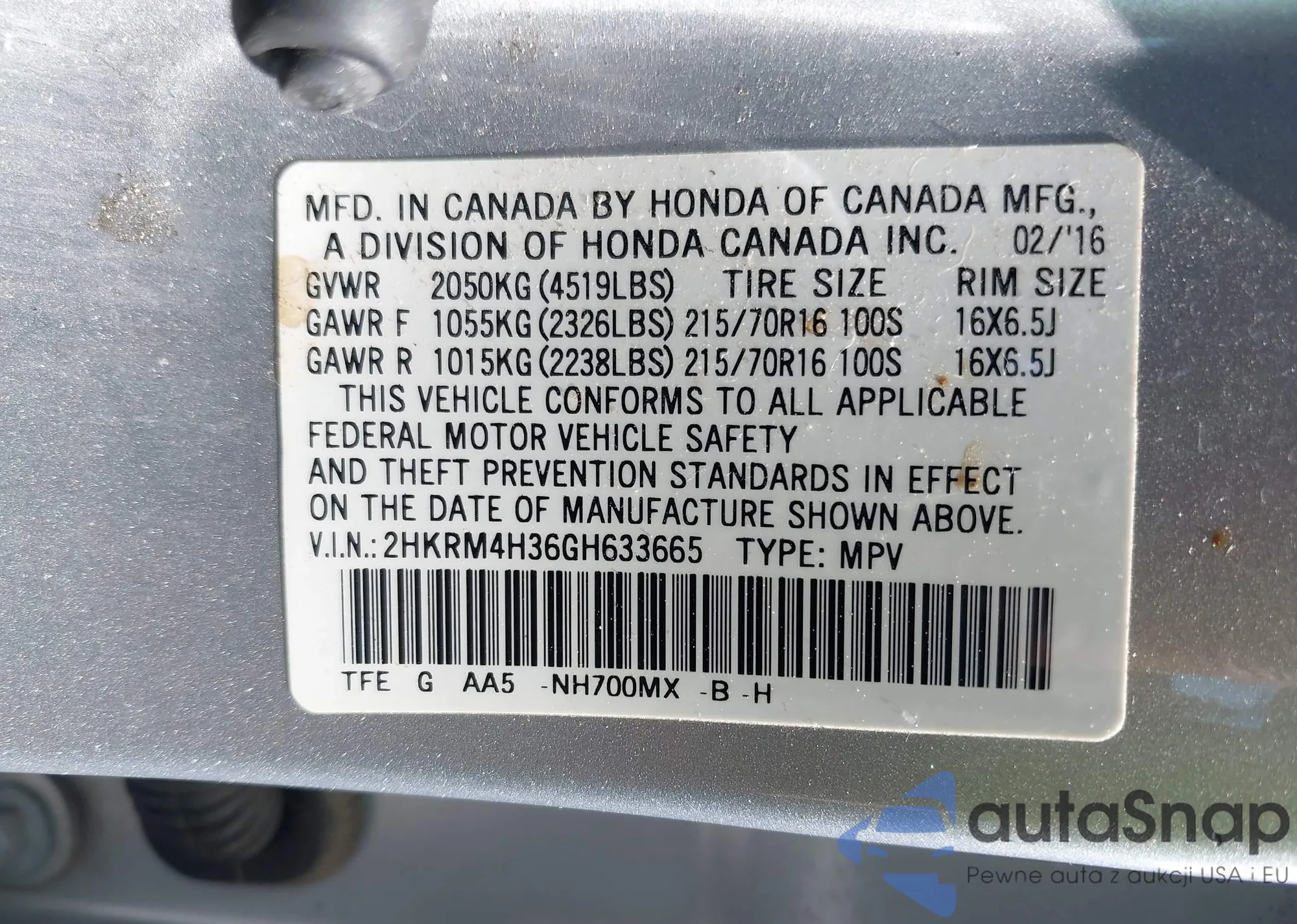 • VIN 2HKRM4H36GH633665