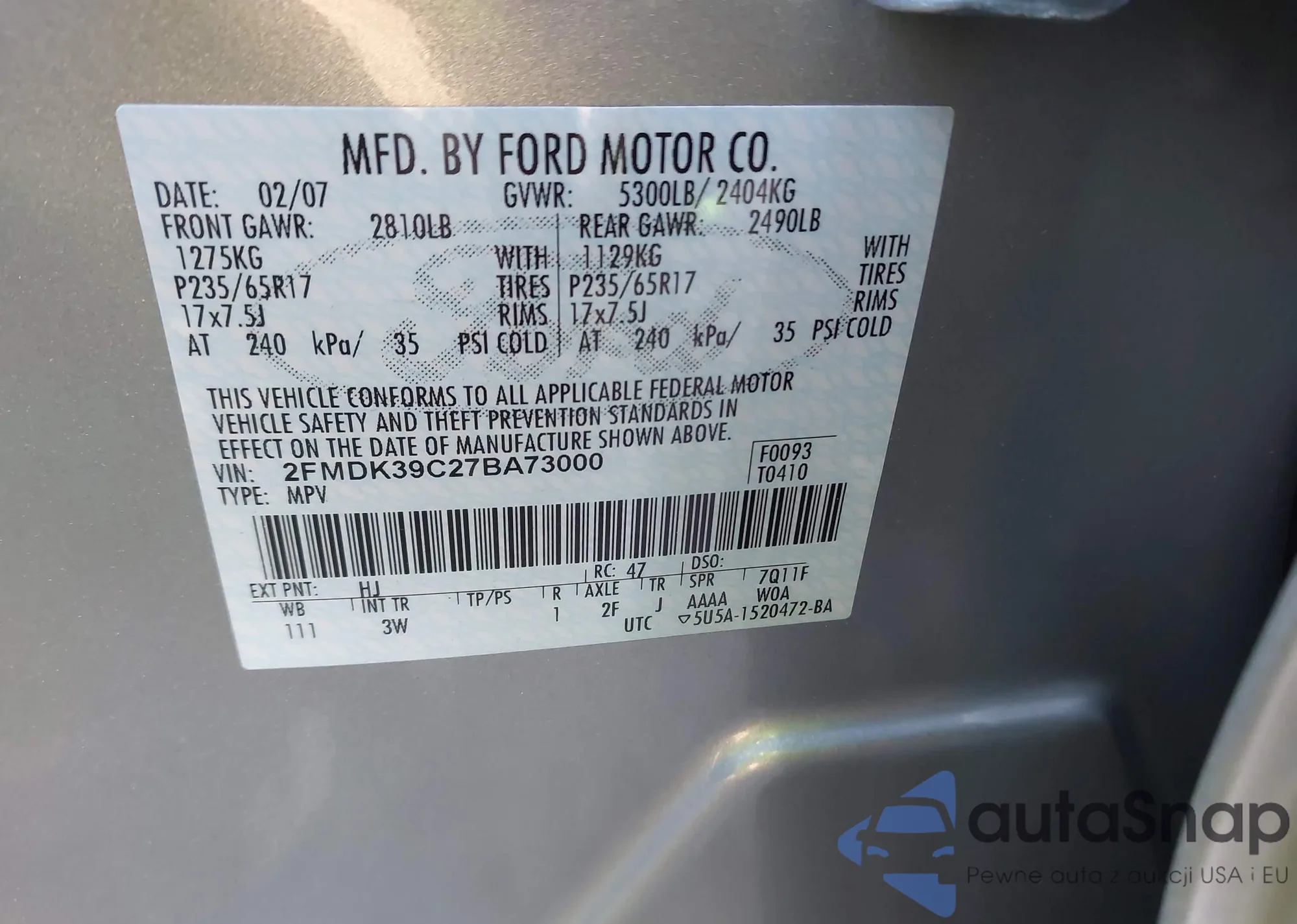 • VIN 1FMZU73K45ZA17254