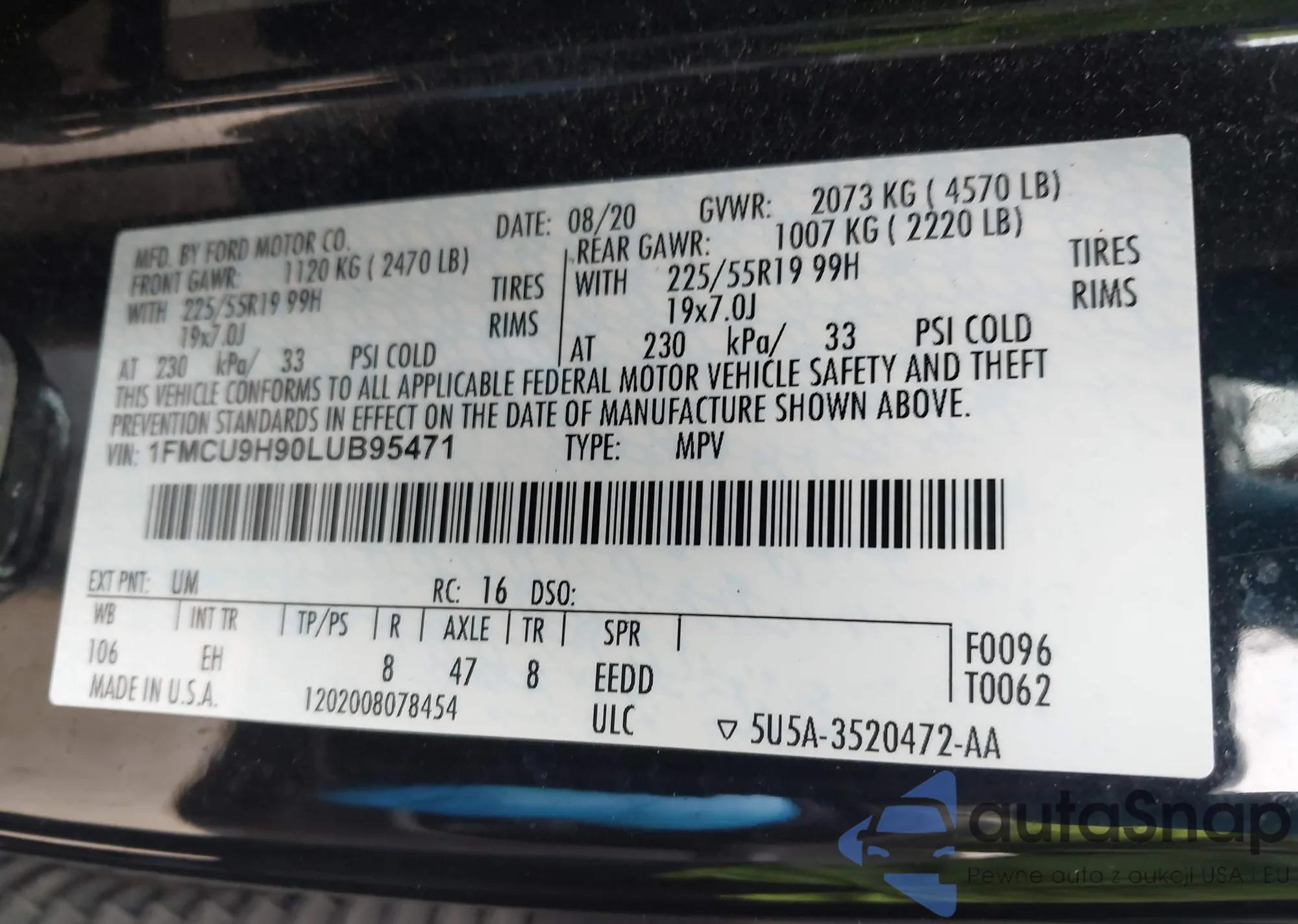 LOT: 41790095 VIN: 1FMCU9H90LUB95471