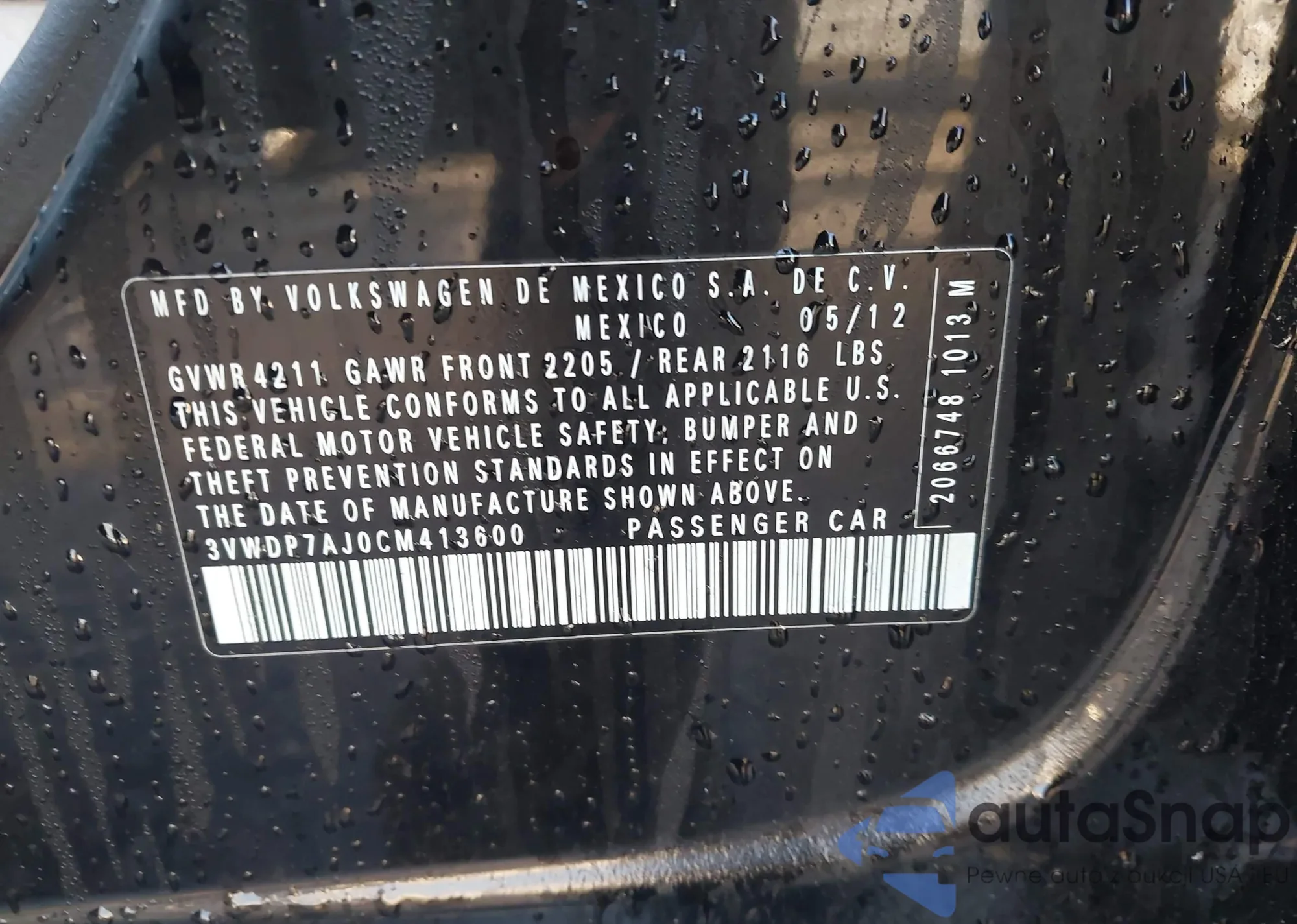• VIN 3VWDP7AJ0CM413600