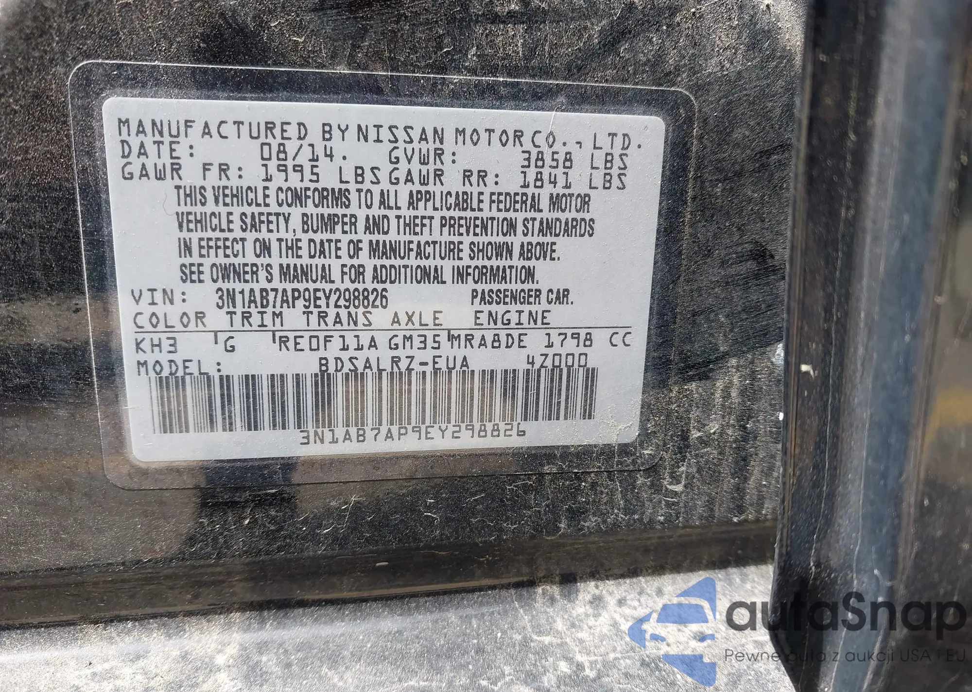 LOT: 42003429 VIN: 3N1AB7AP9EY298826