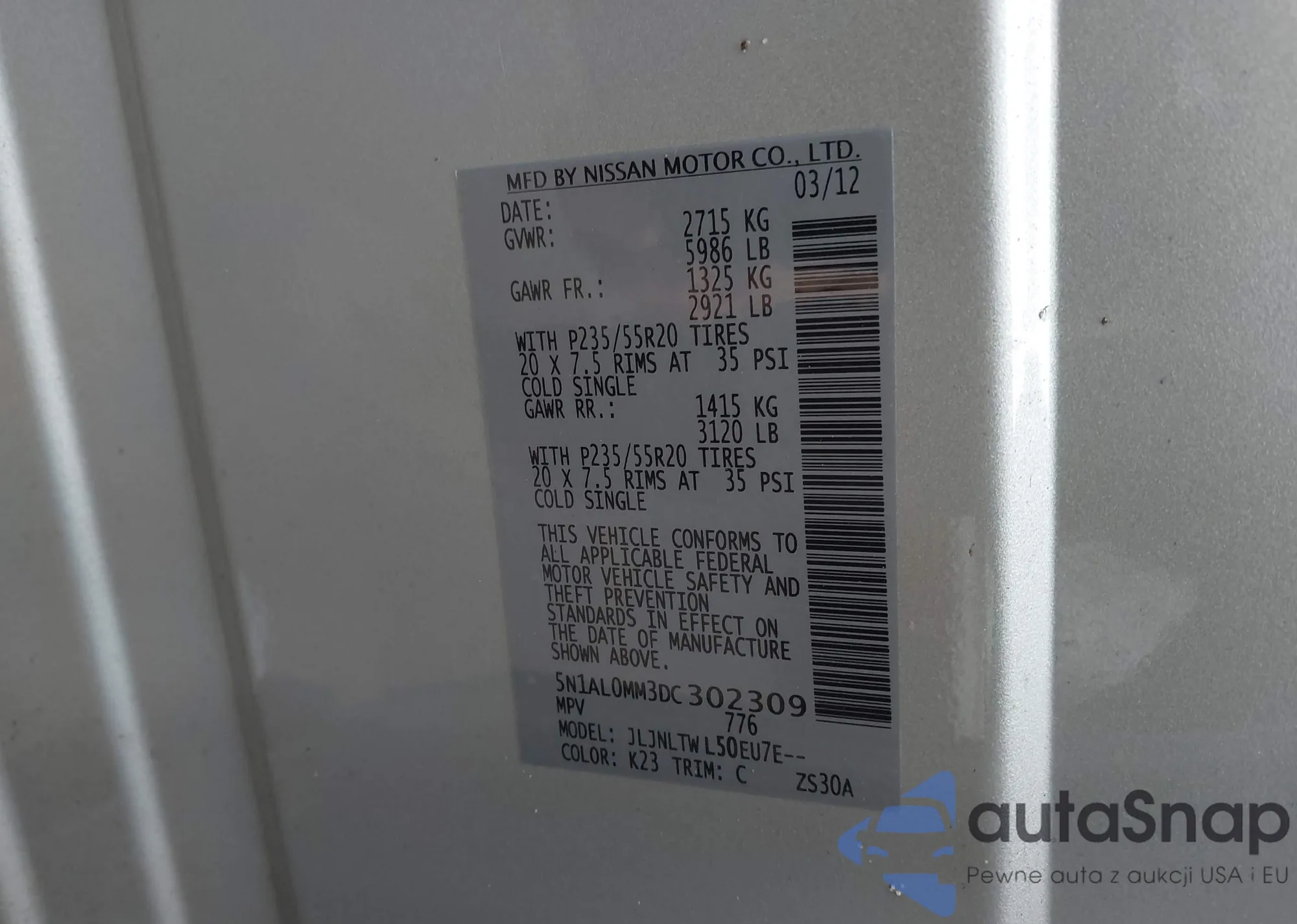 • VIN 5N1AL0MM3DC302309