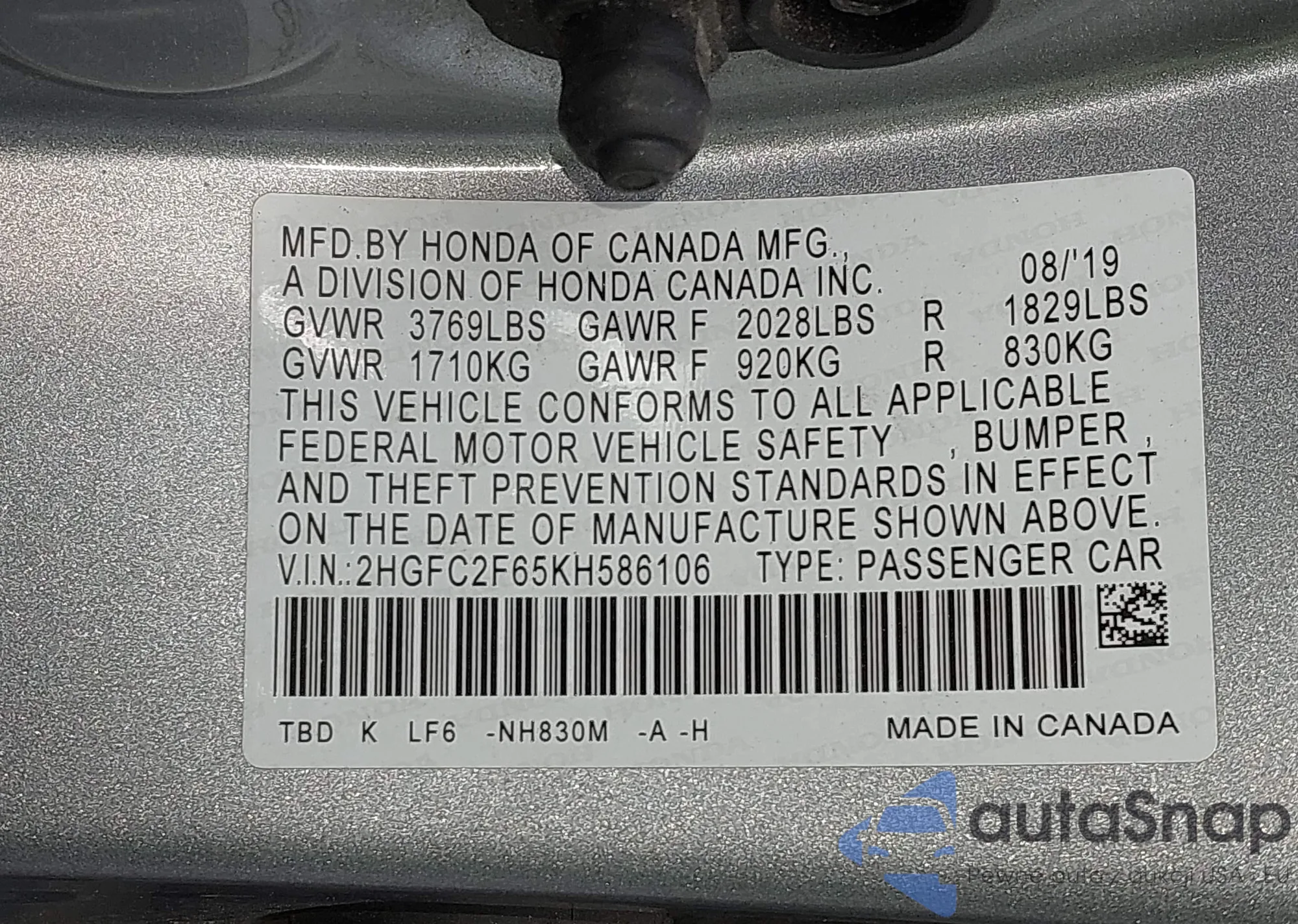 • VIN 2HGFC2F65KH586106