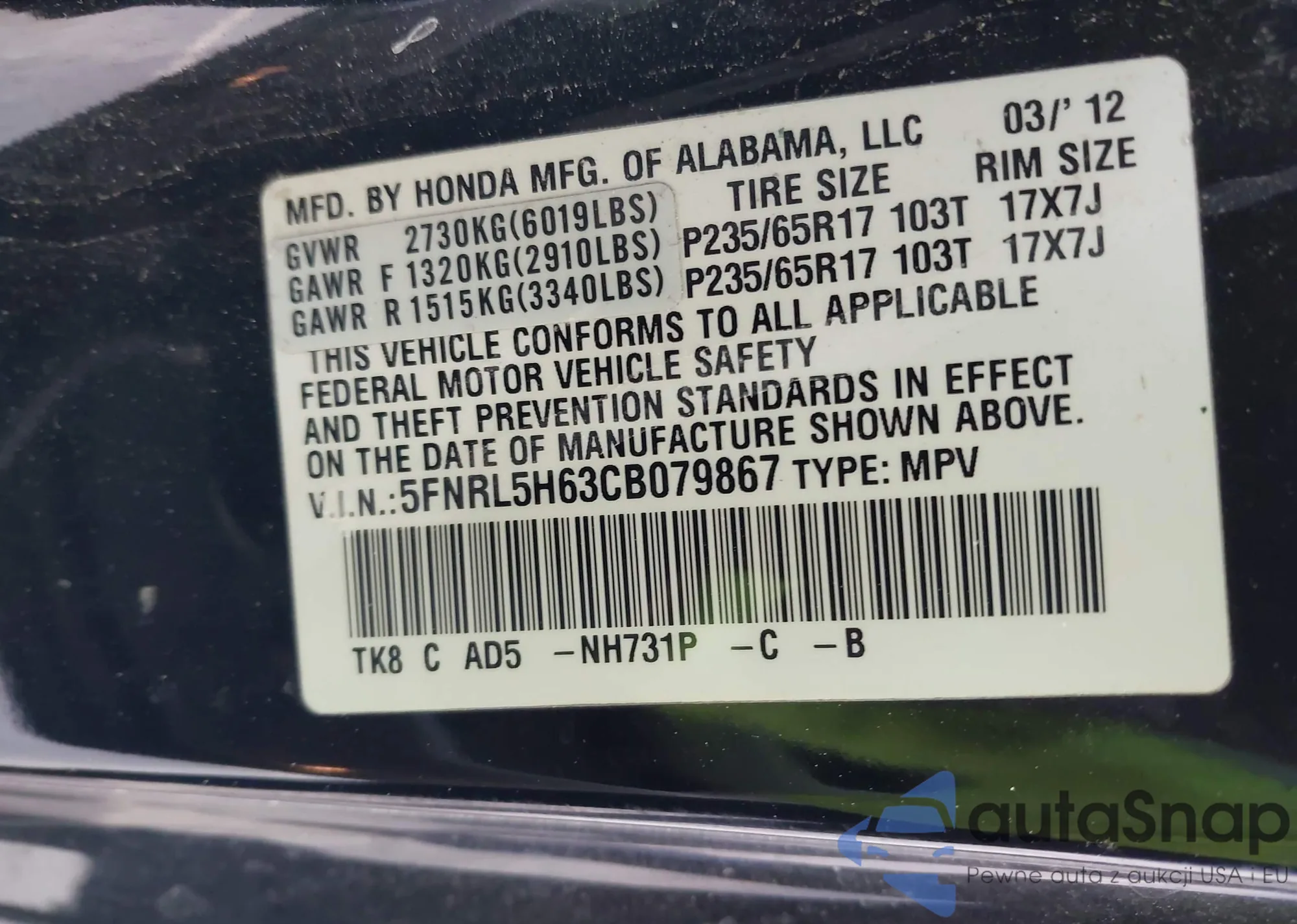 • VIN 5FNRL5H63CB079867