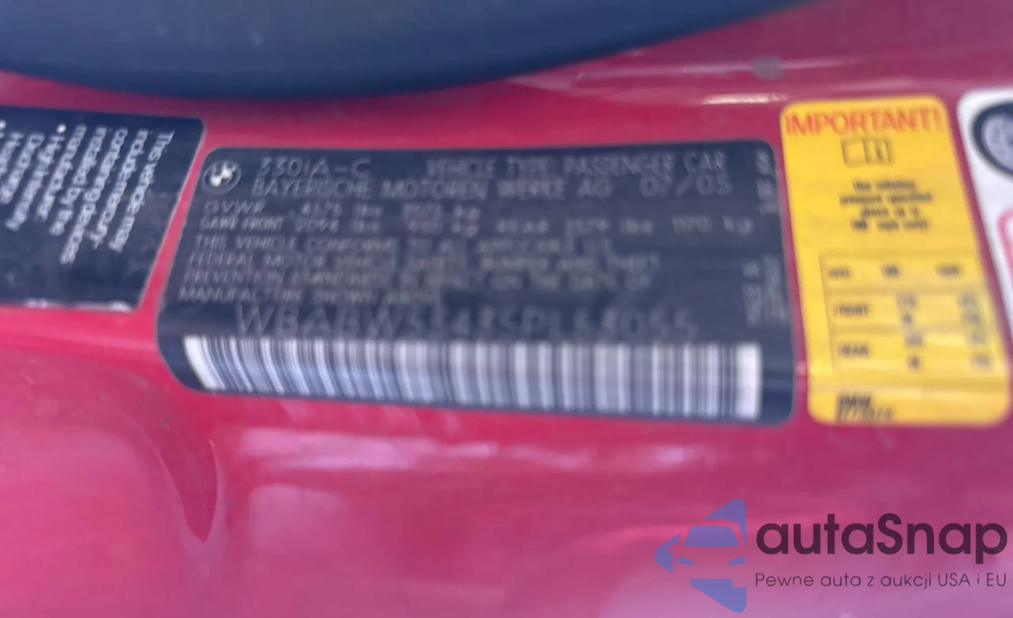 2005 BMW 330 Ci z USA, uszkodzony, nr VIN WBABW53435PL53055