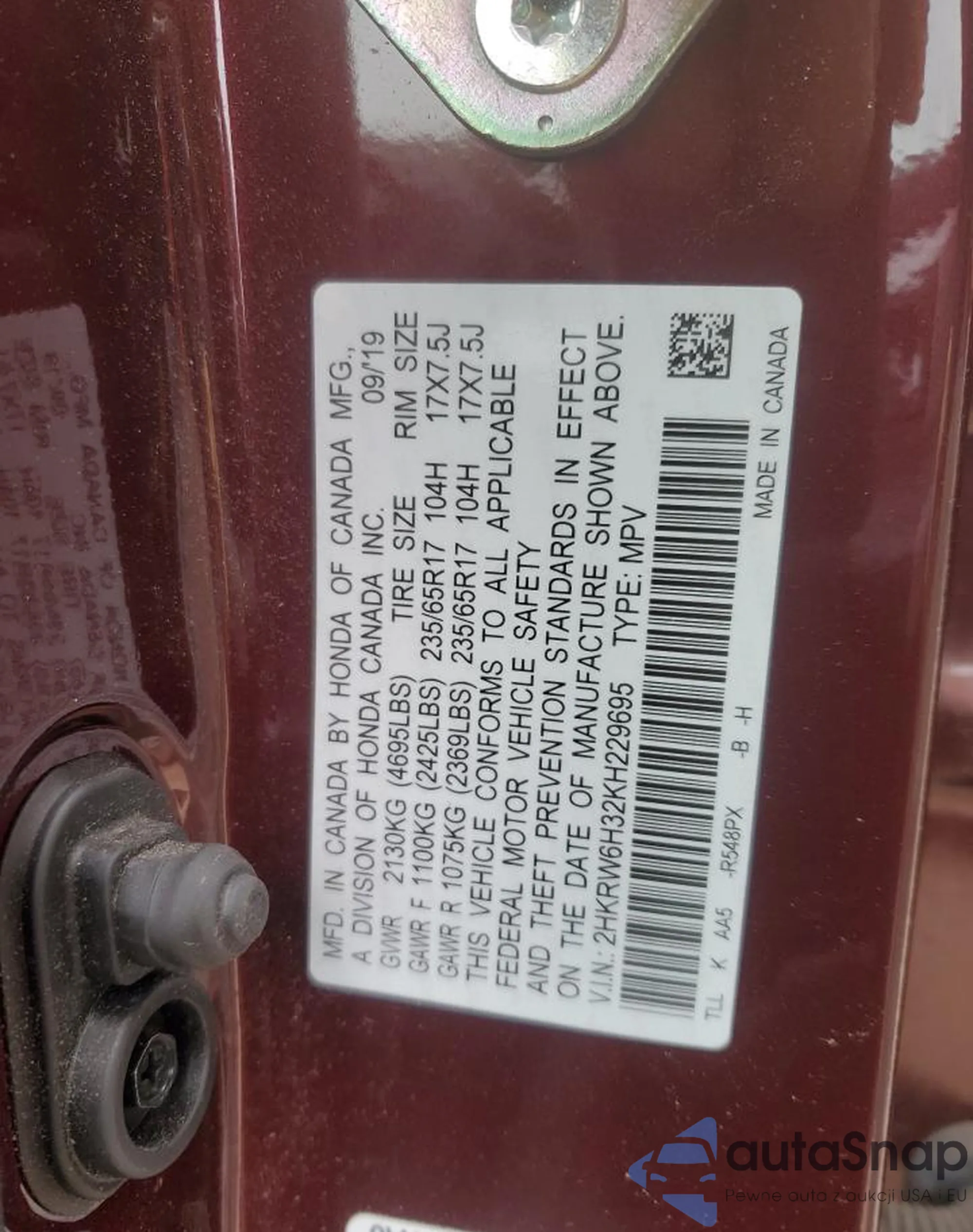 • VIN 2HKRW6H32KH229695