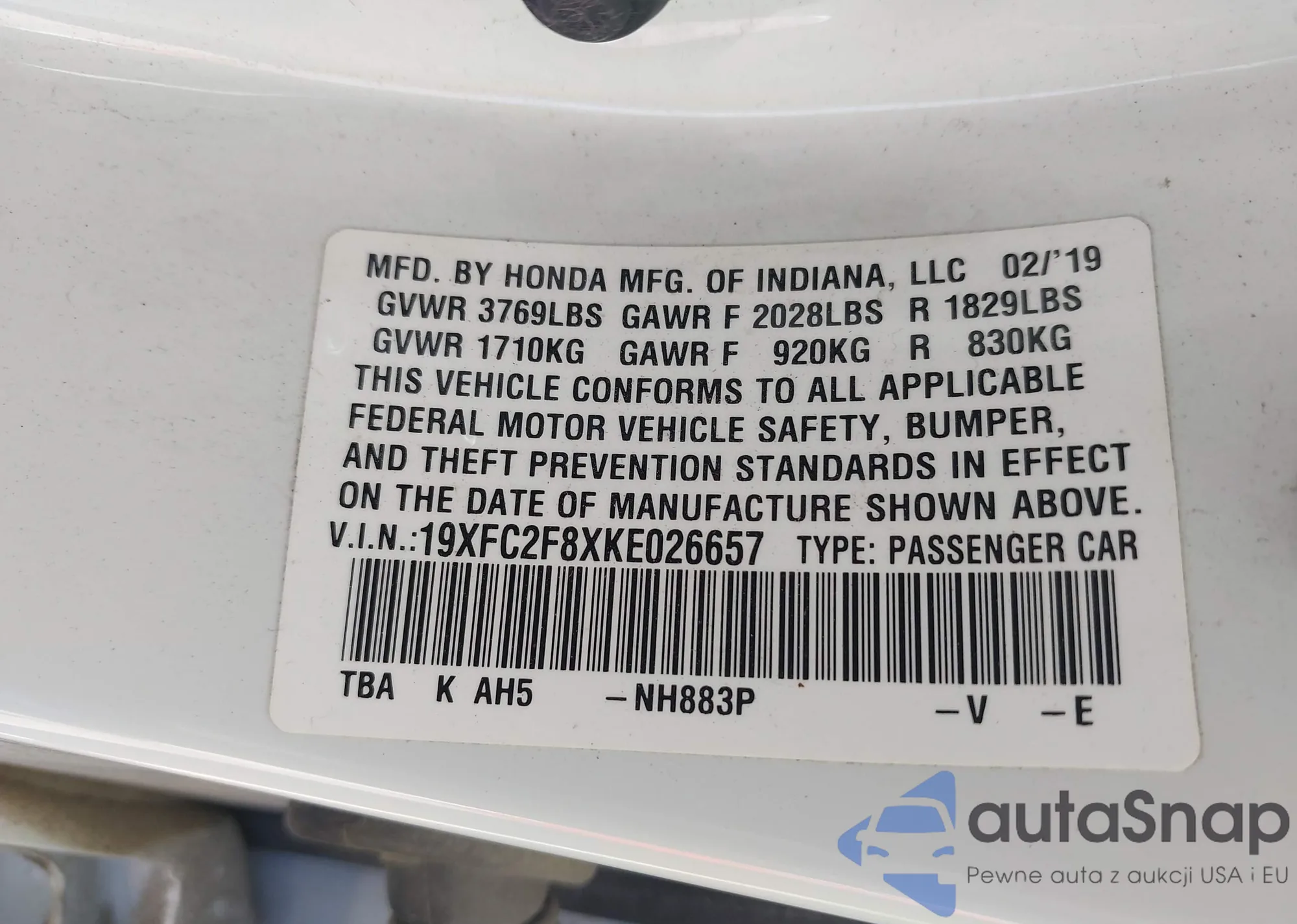 • VIN 19XFC2F8XKE026657