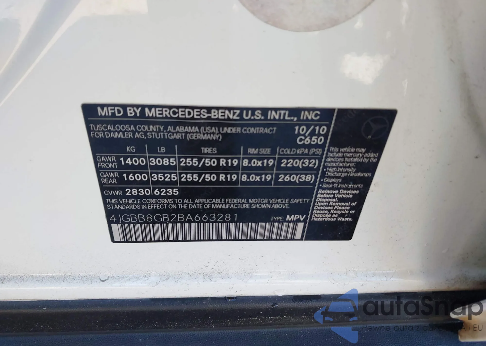 • VIN 4JGBB8GB2BA663281