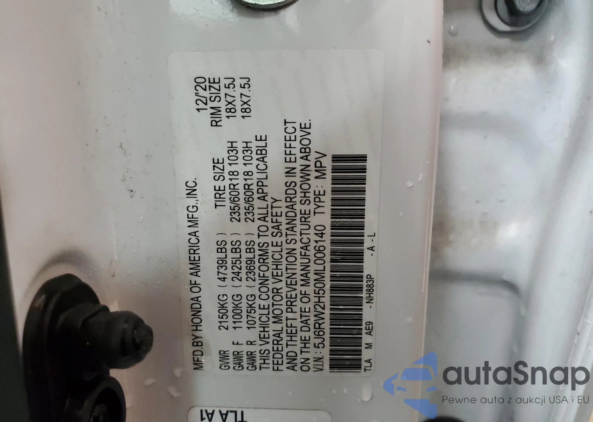 • VIN 5J6RW2H50ML006140